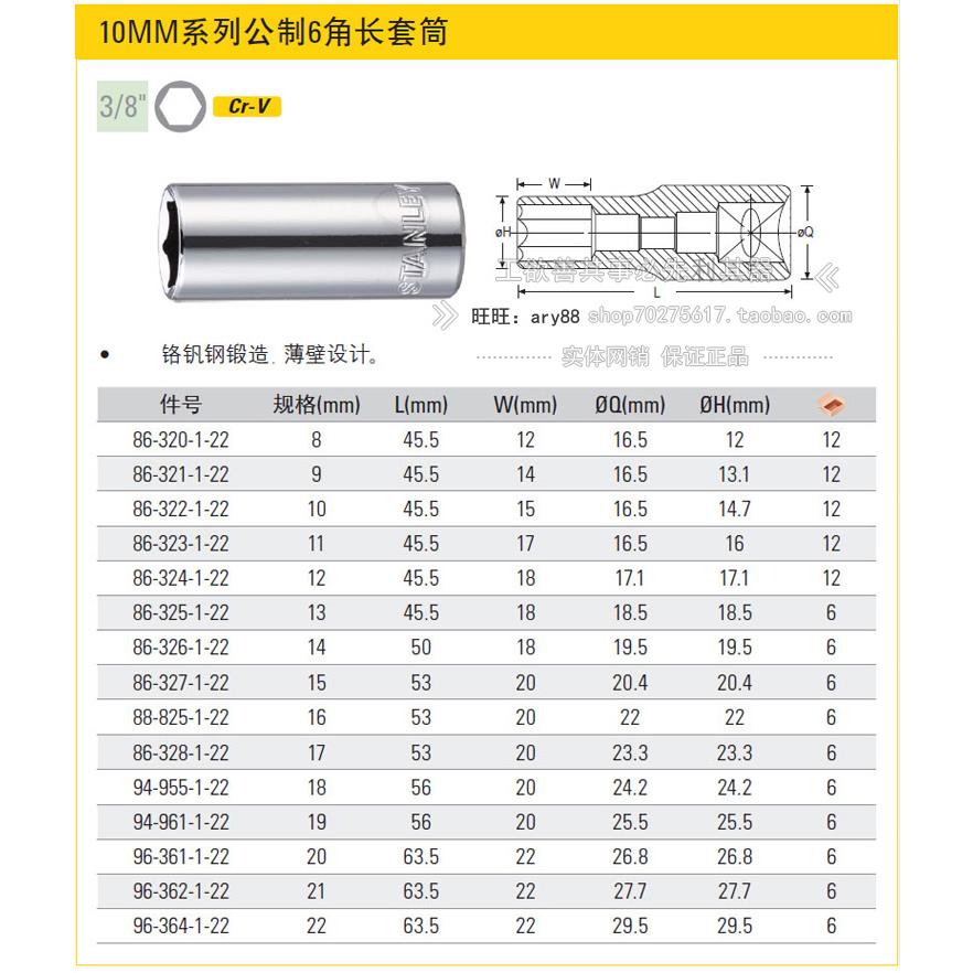 史丹利10MM系列公制6角长套筒扳手3/8薄壁铬钒钢8-22mm86-320/322