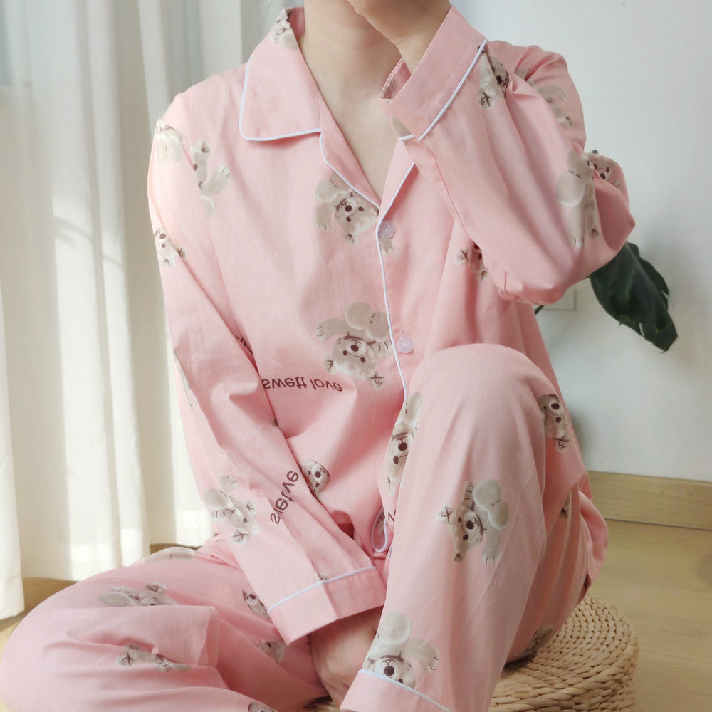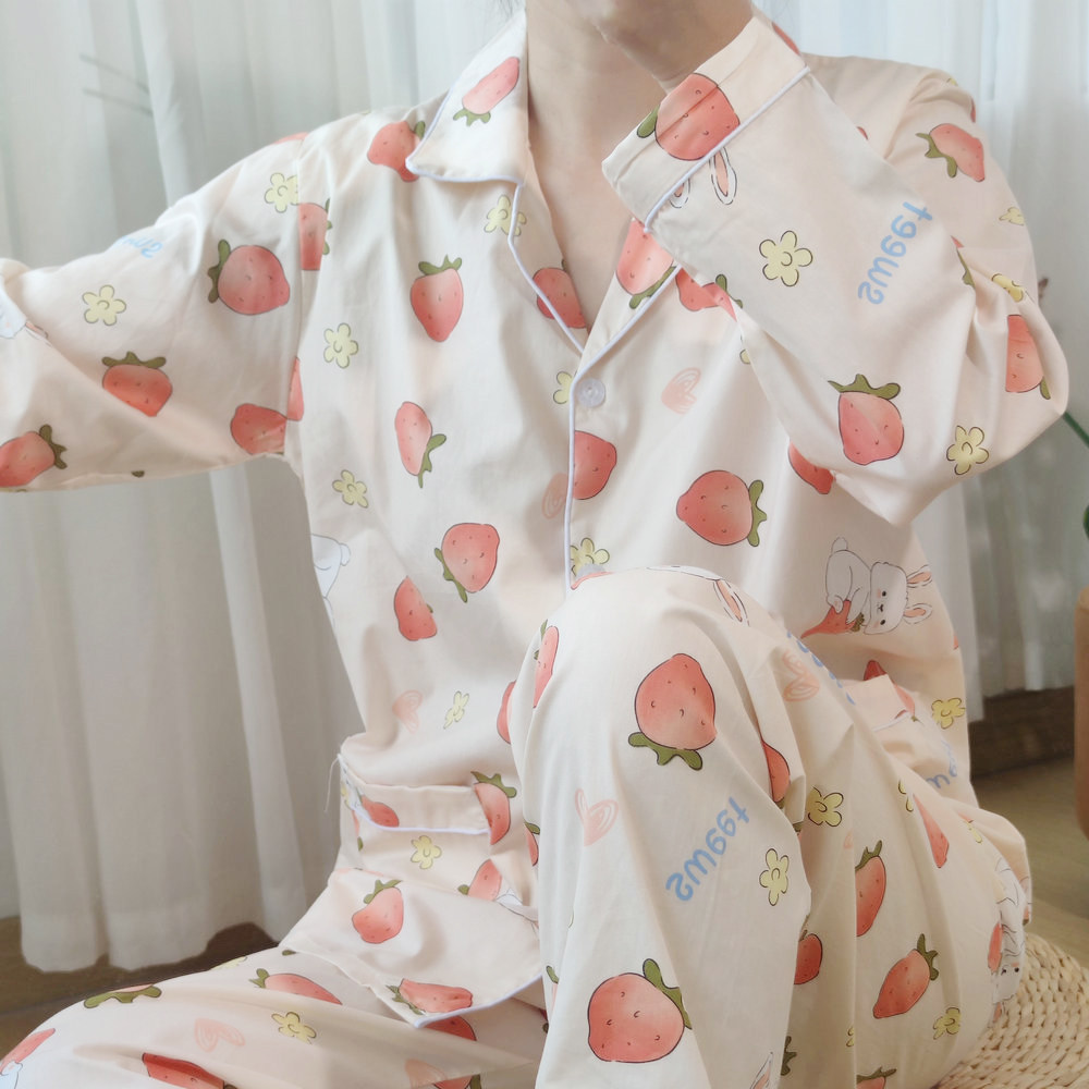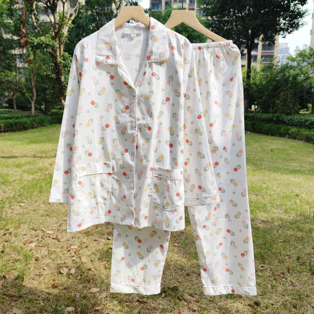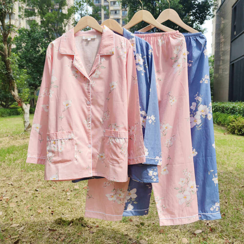 100%纯棉斜纹棉布春夏长袖清新小碎花睡衣女士全棉薄款翻领家居服