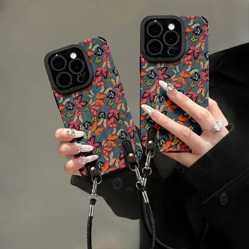 彩色蝴蝶适用苹果16promax手机壳新款iphone15pro全包小羊皮14plus带皮质挂绳13小众6耐看12防摔11高级感女87