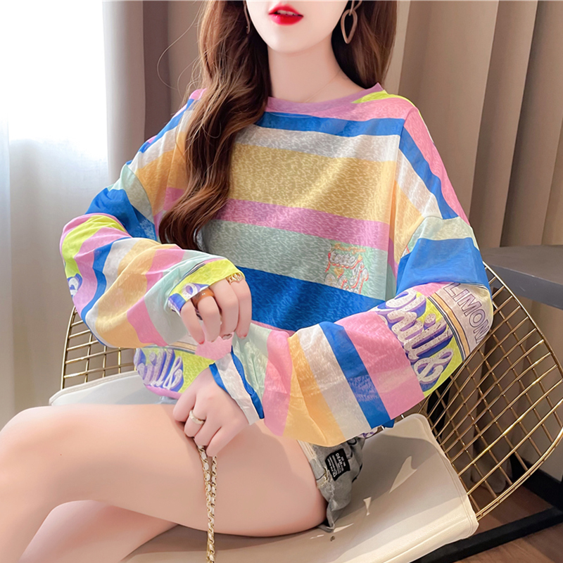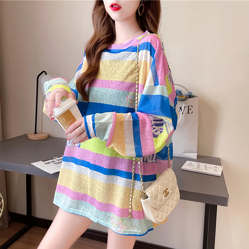 长袖t恤女夏季韩版宽松大码中长款防晒衣薄款条纹空调衫罩衫上衣