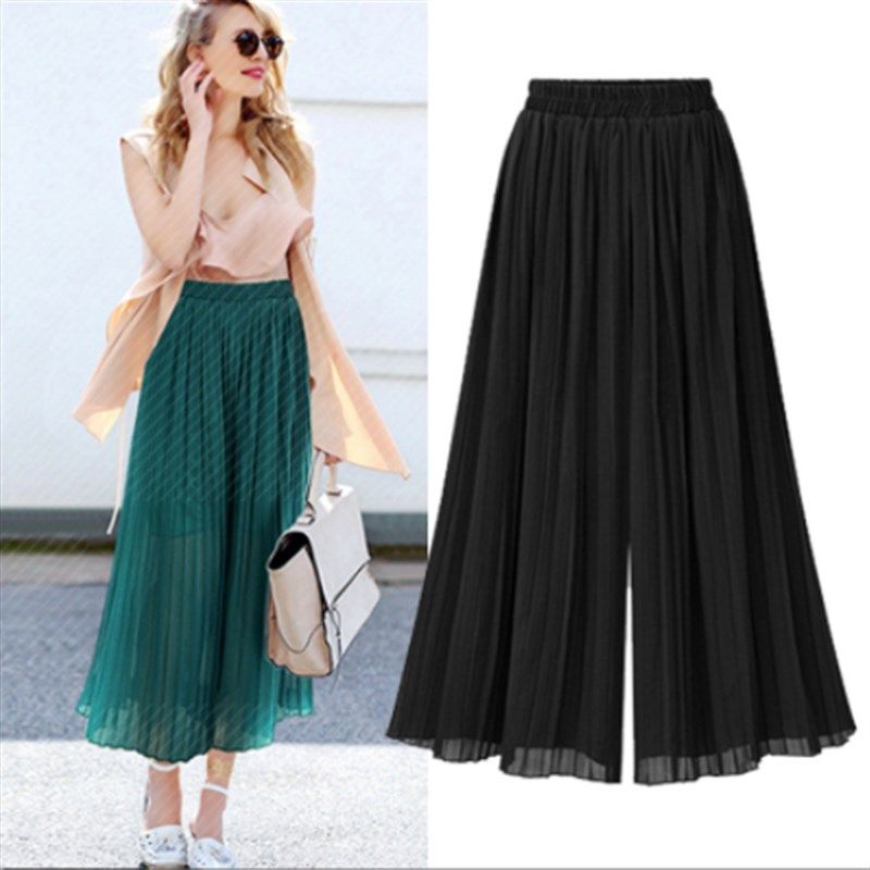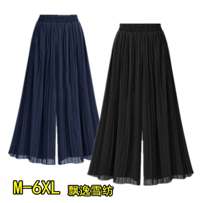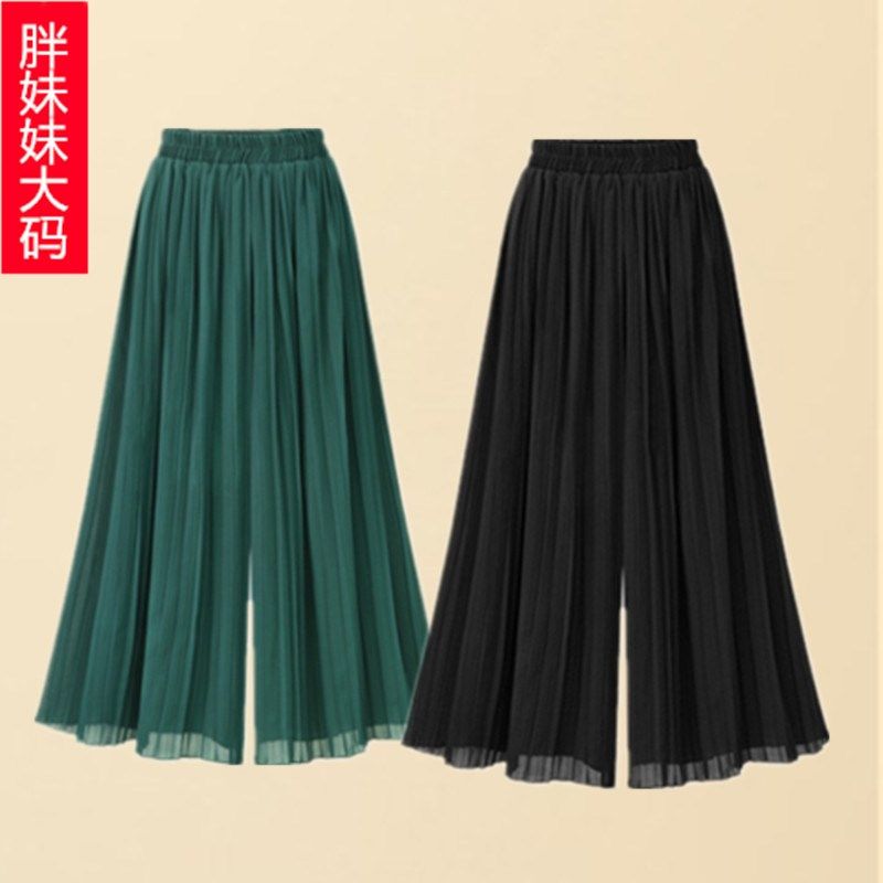 特大码雪纺阔腿裤女胖mm宽松垂感大脚裤妈妈九分裤200斤百褶裙裤