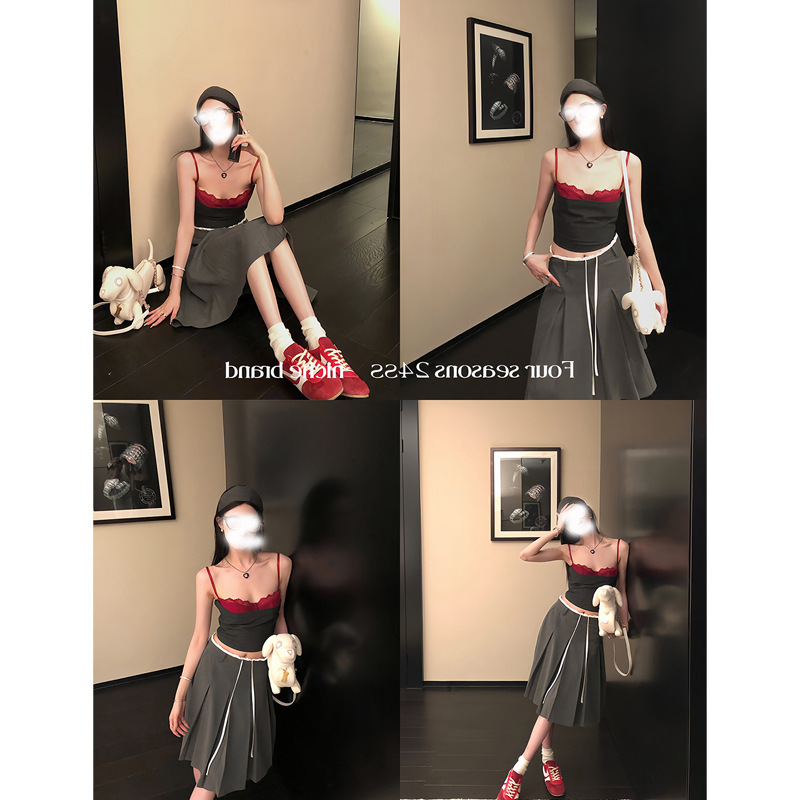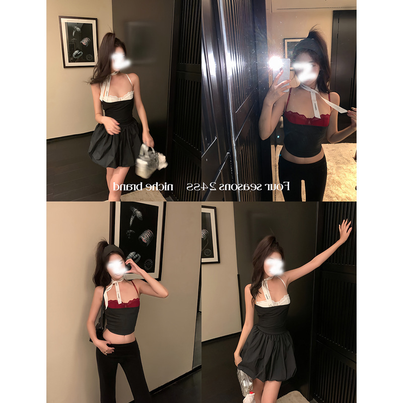 欧阳假两件天丝亚麻蕾丝吊带背心女夏季辣妹外穿修身短款上衣