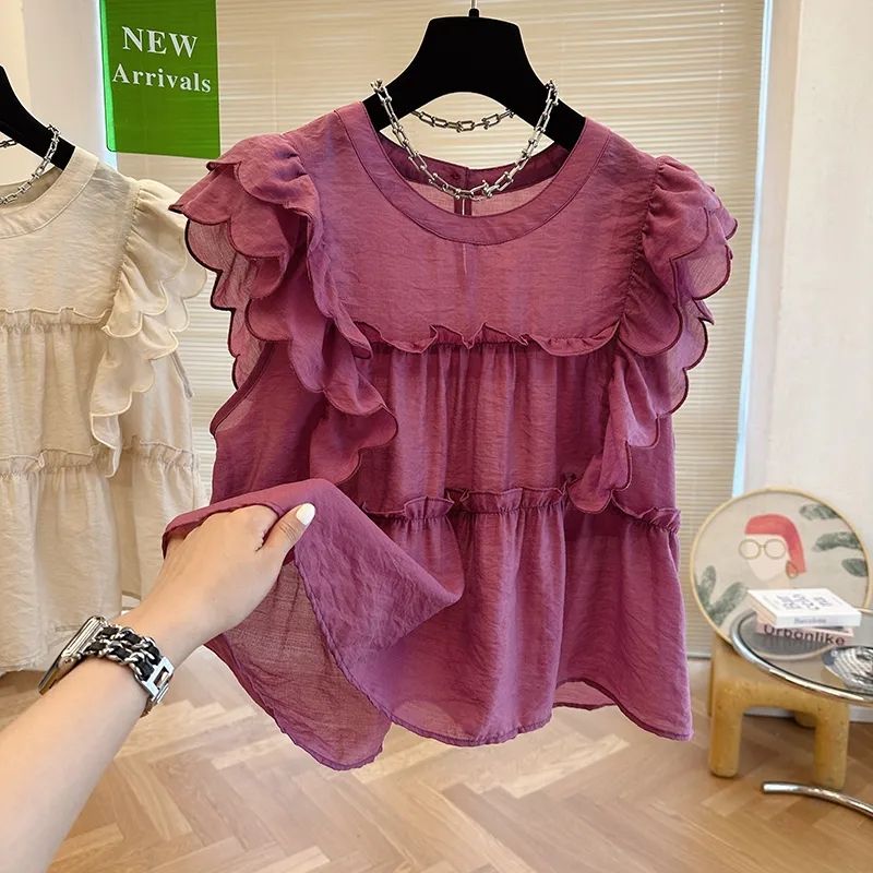 法式荷叶边飞飞袖圆领衬衫女夏季甜美娃娃衫宽松小众别致无袖上衣