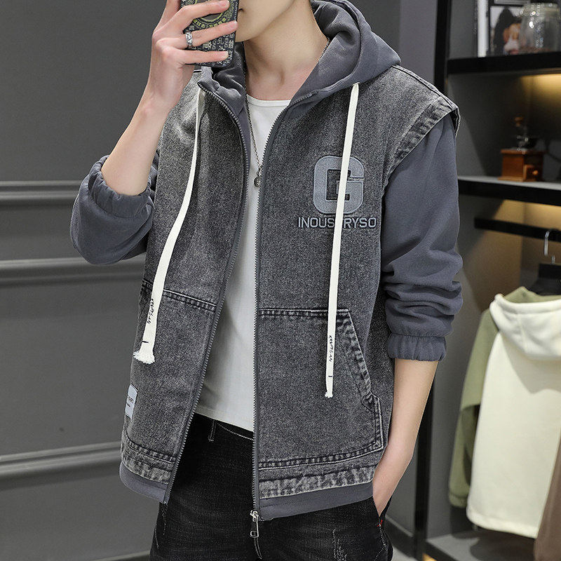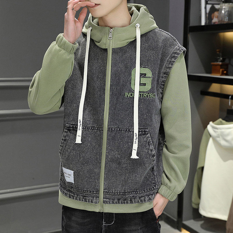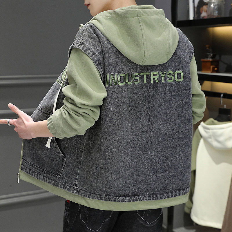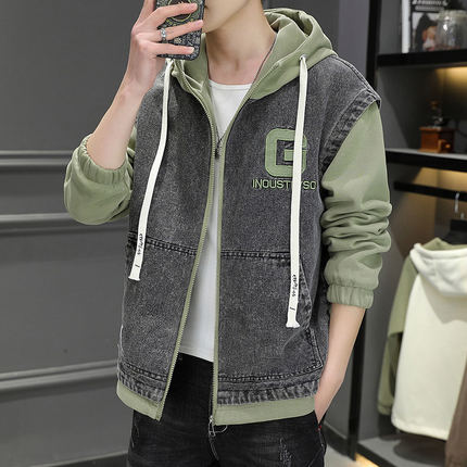 牛仔外套男2026连帽卫衣春秋季潮流假两件拼接学生休闲夹克上衣潮