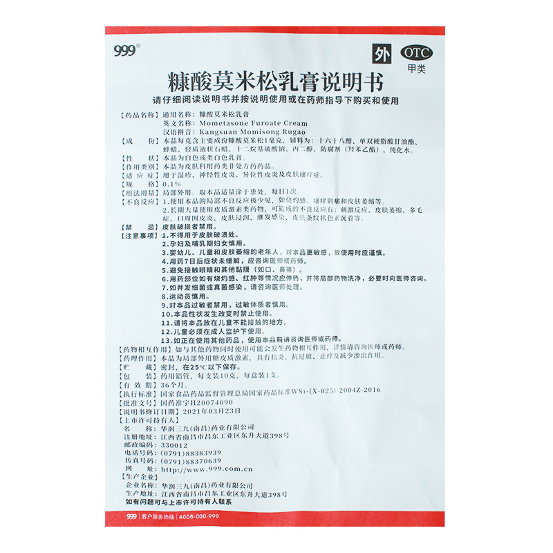【999】糠酸莫米松乳膏0.1%*10g*1支/盒