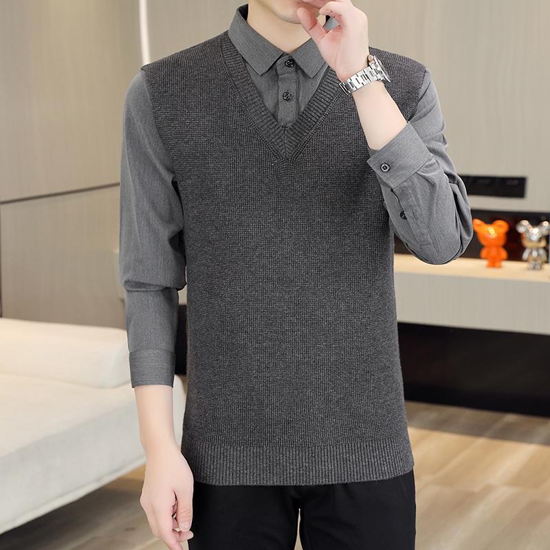 男士鸡心领针织马甲衬衫假两件打底衫修身商务衬衫领毛衣男1010r