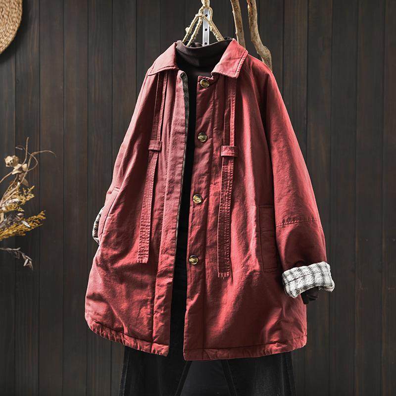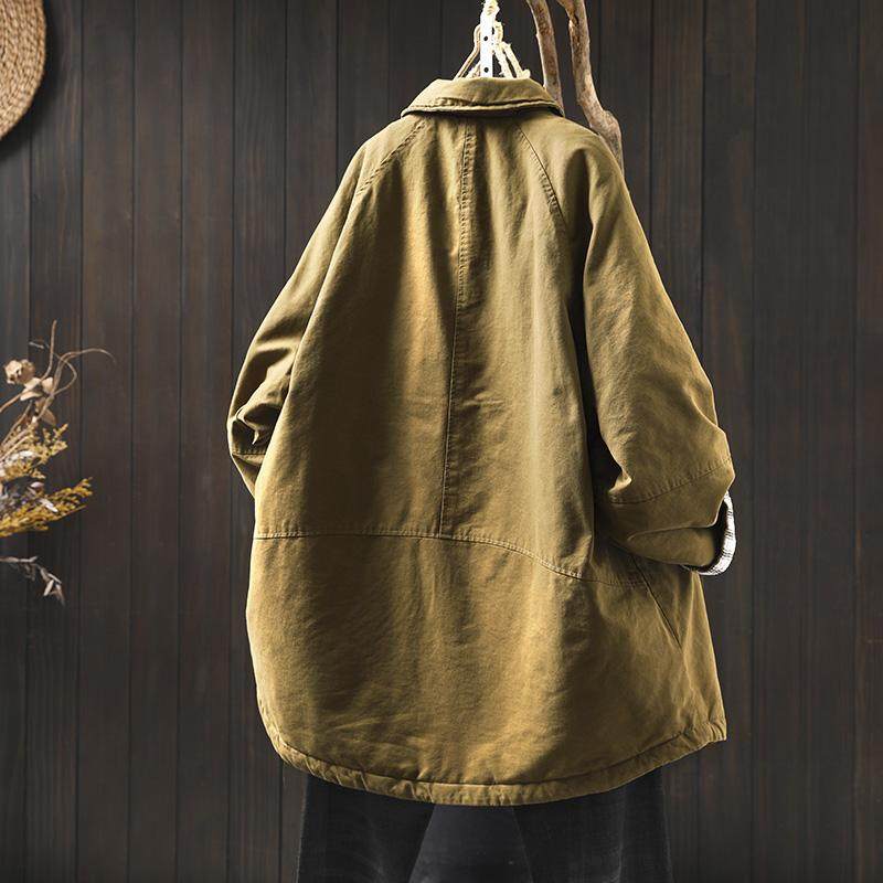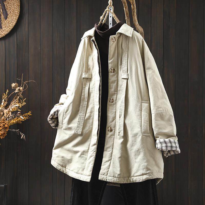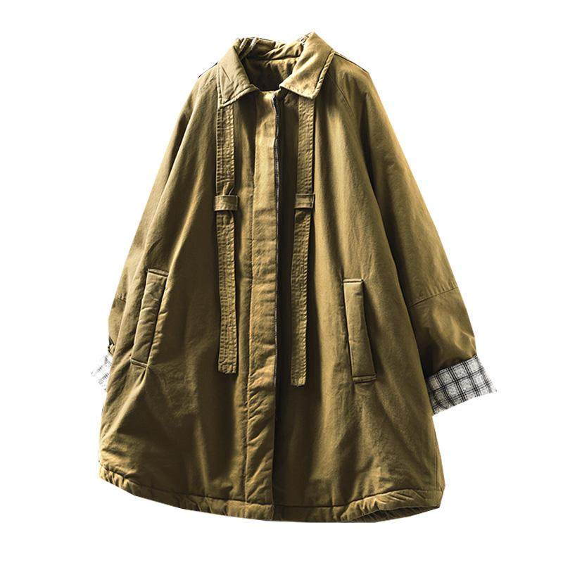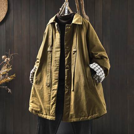 纯棉翻领夹棉加厚棉服外套女宽松大码冬季复古休闲中长款保暖棉衣
