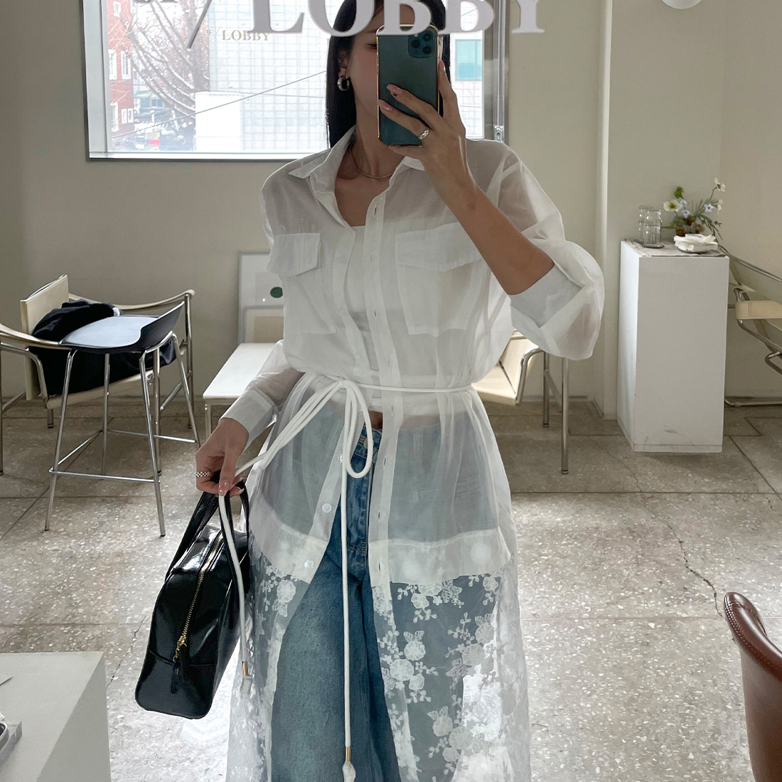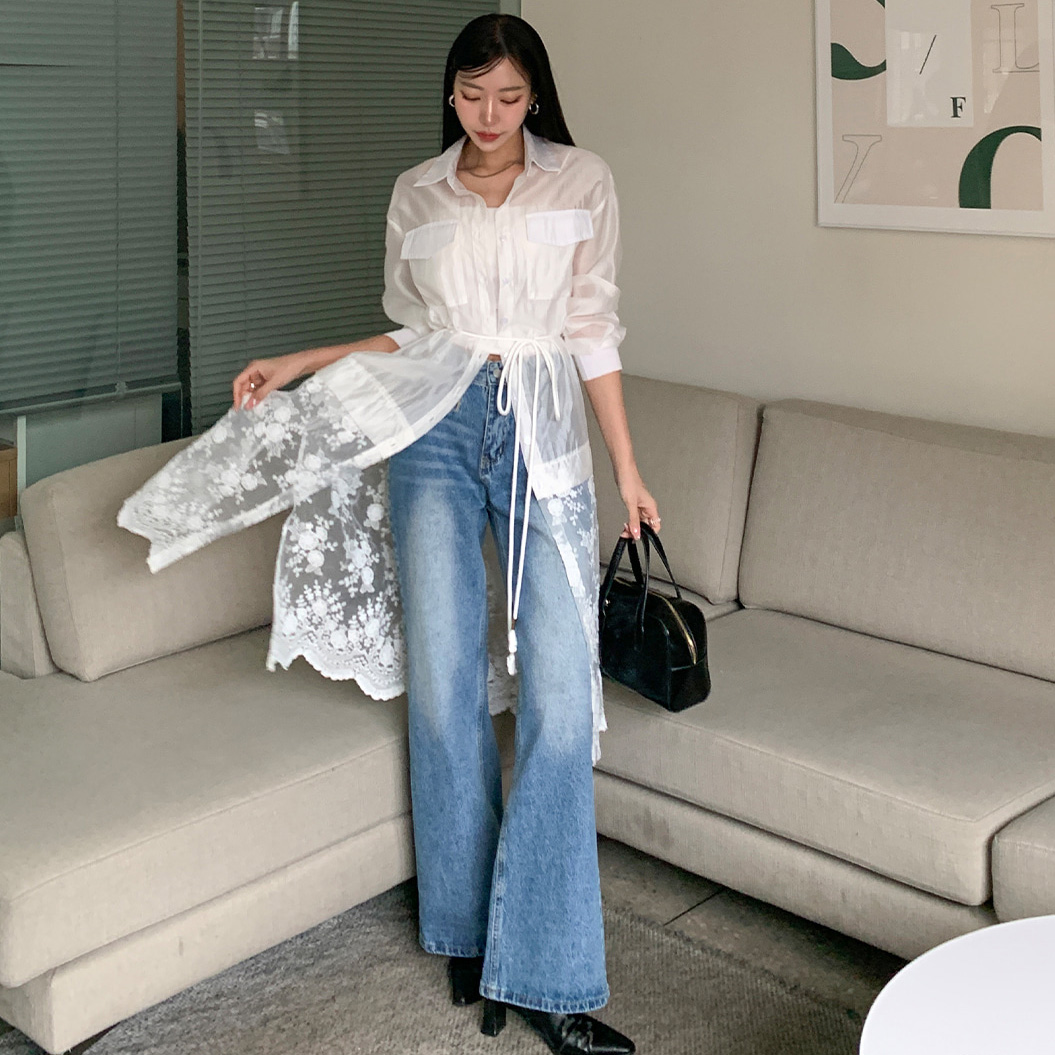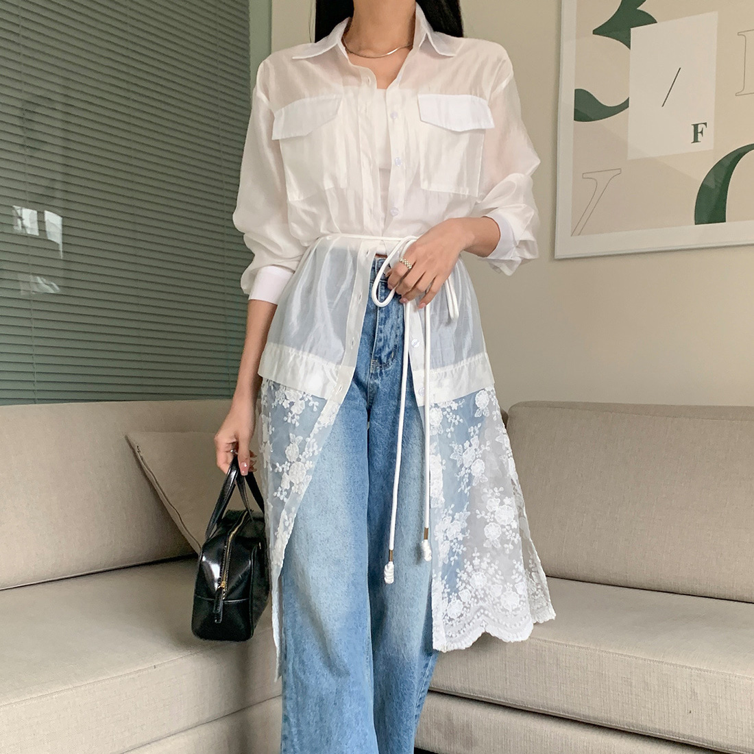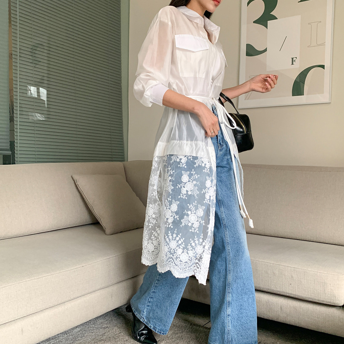 韩国东大门2025新款设计感薄款透视蕾丝花边拼接中长款衬衫连衣裙