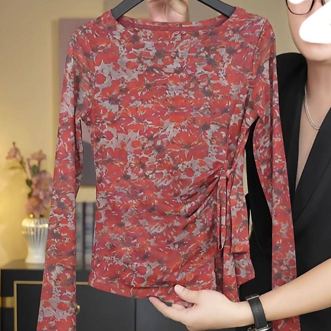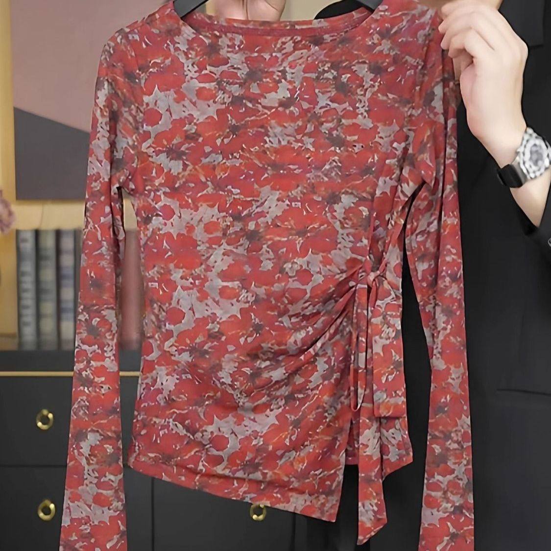 大码女装秋季新款双层网纱绑带长袖碎花T恤修身洋气复古胖mm上衣