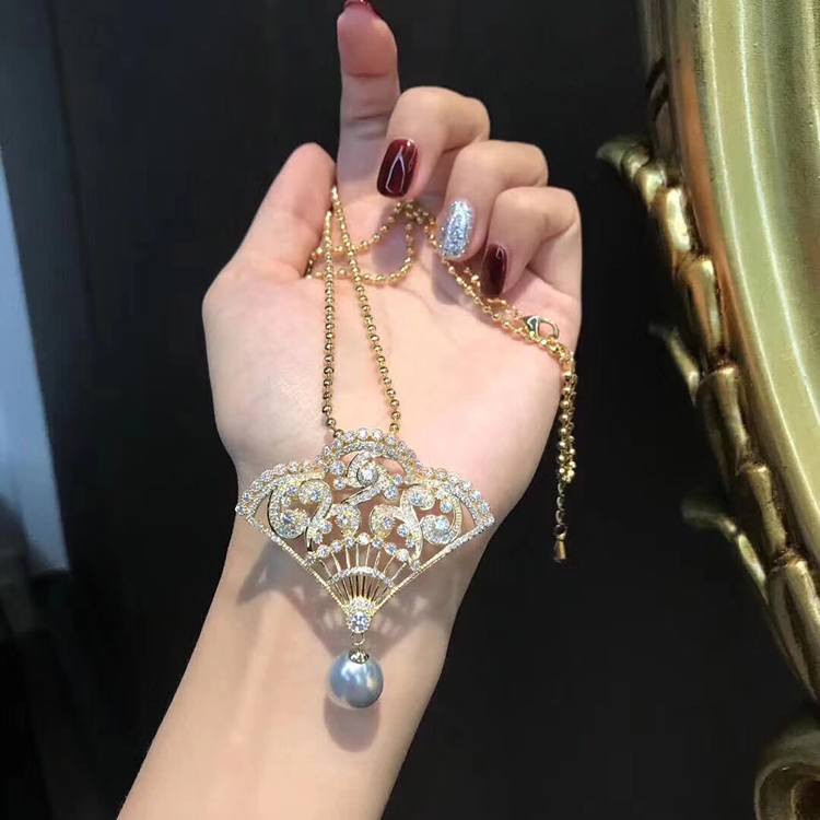 DIY配件 厚镀金宫廷风格扇形胸花毛衣链别针珍珠胸针空托半成品女