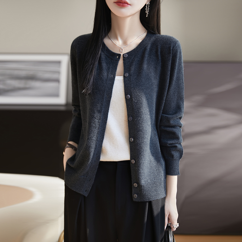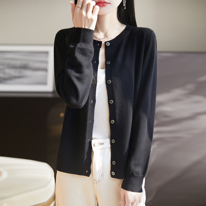 精纺100%丝光纯羊毛开衫女宽松基础款百搭毛衣外套针织衫上衣外搭