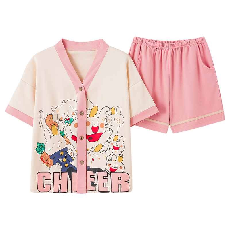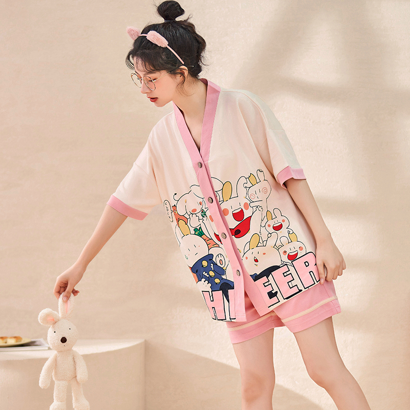 纯棉短袖女士睡衣夏季新款大码休闲开衫可外穿套装时尚简约家居服