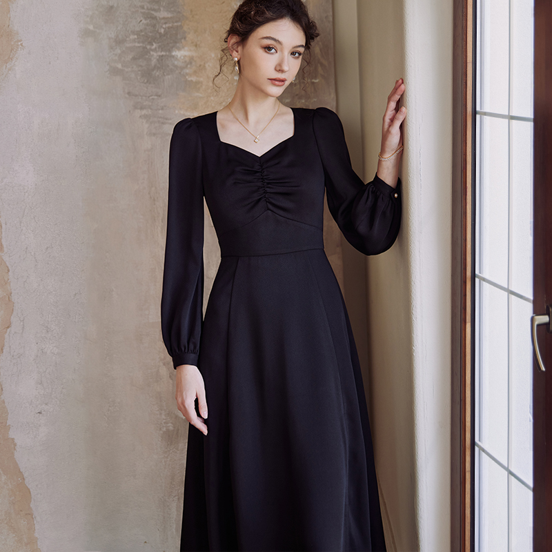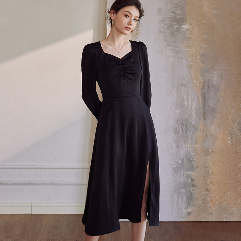 罗衣优雅大摆缎面连衣裙女2025秋季新款气质褶皱黑色中长裙08081