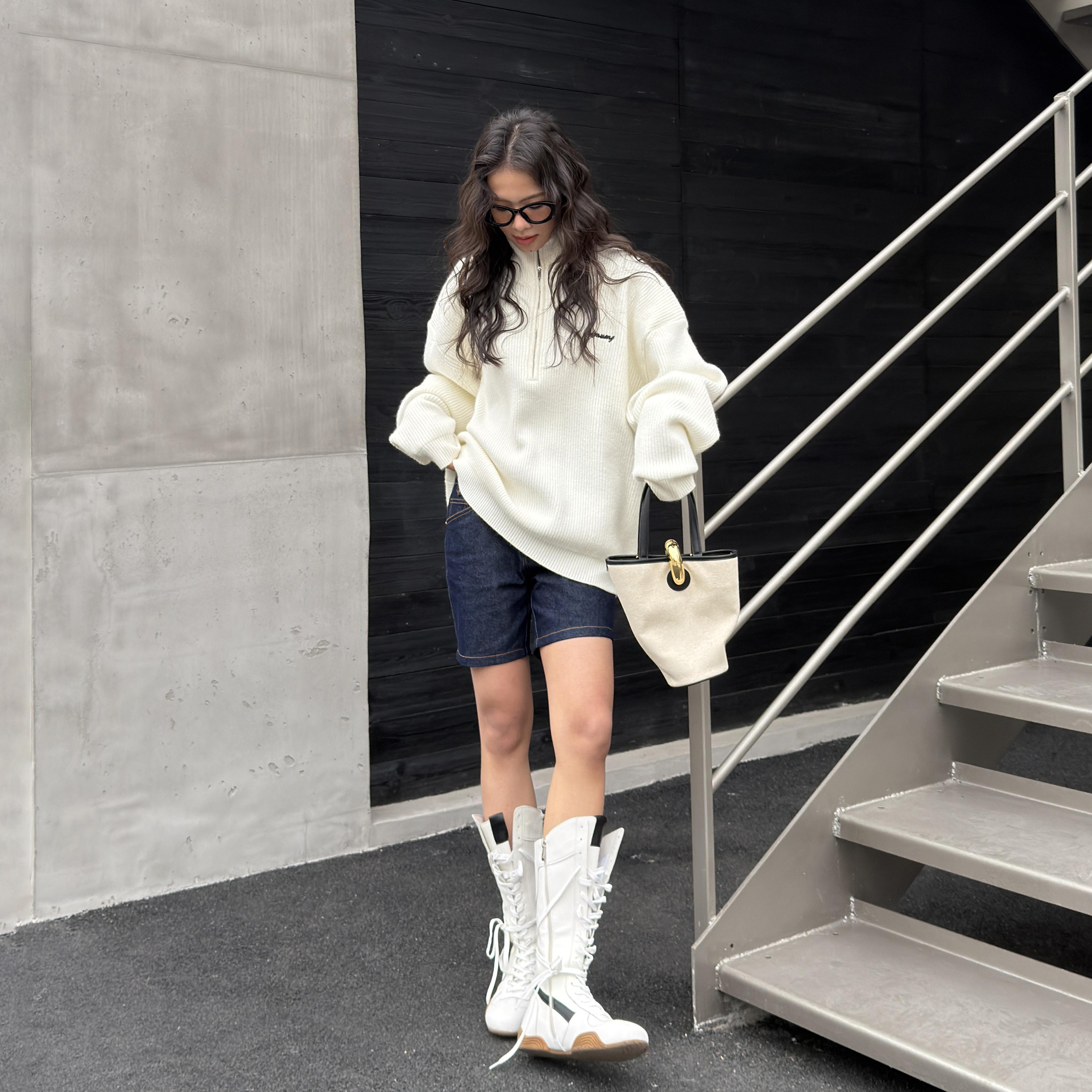 LEDIM WANG立领条纹毛衣女白色垫肩撞色长袖套头上衣2026春季新款