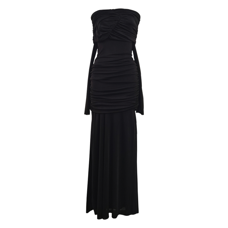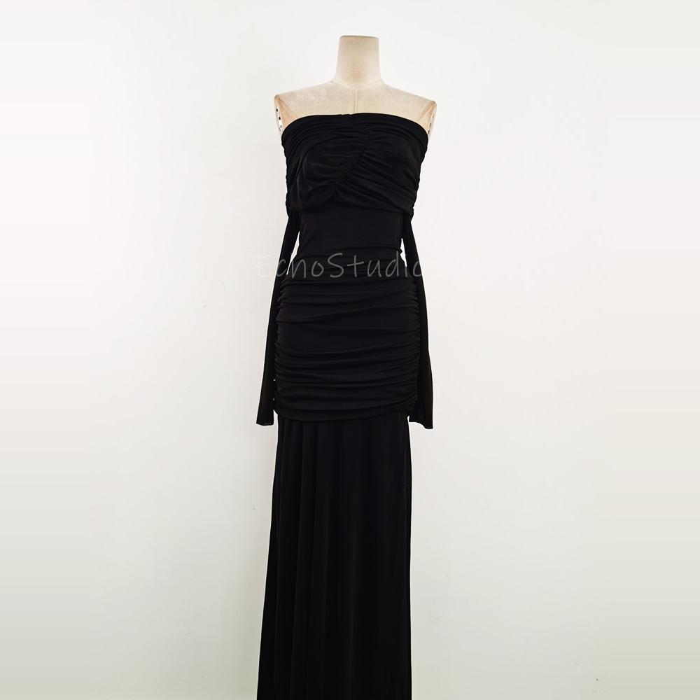 一字肩气质连衣裙越南设计师弹力褶皱长裙女修身显瘦宴会小礼服