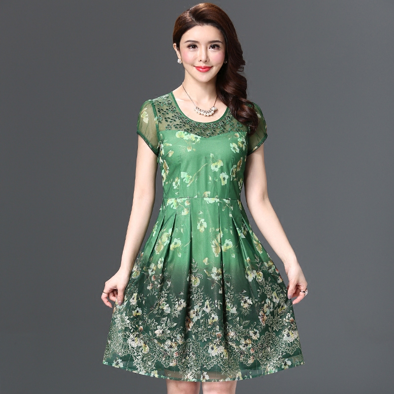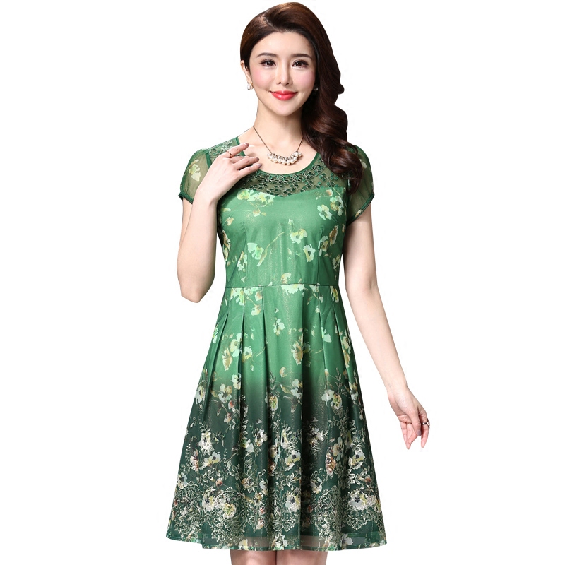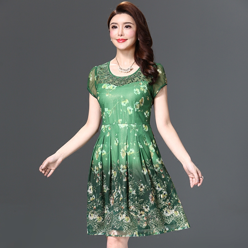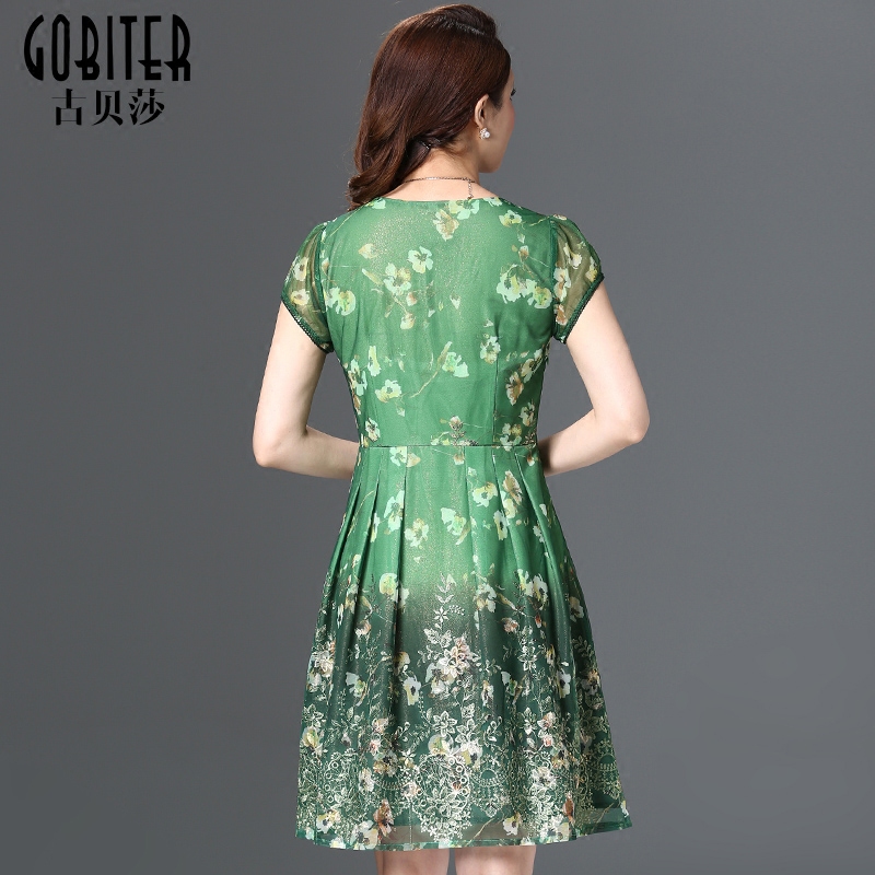 古贝莎夏季新款高端女装品牌连衣裙印花刺绣短袖修身妈妈中裙
