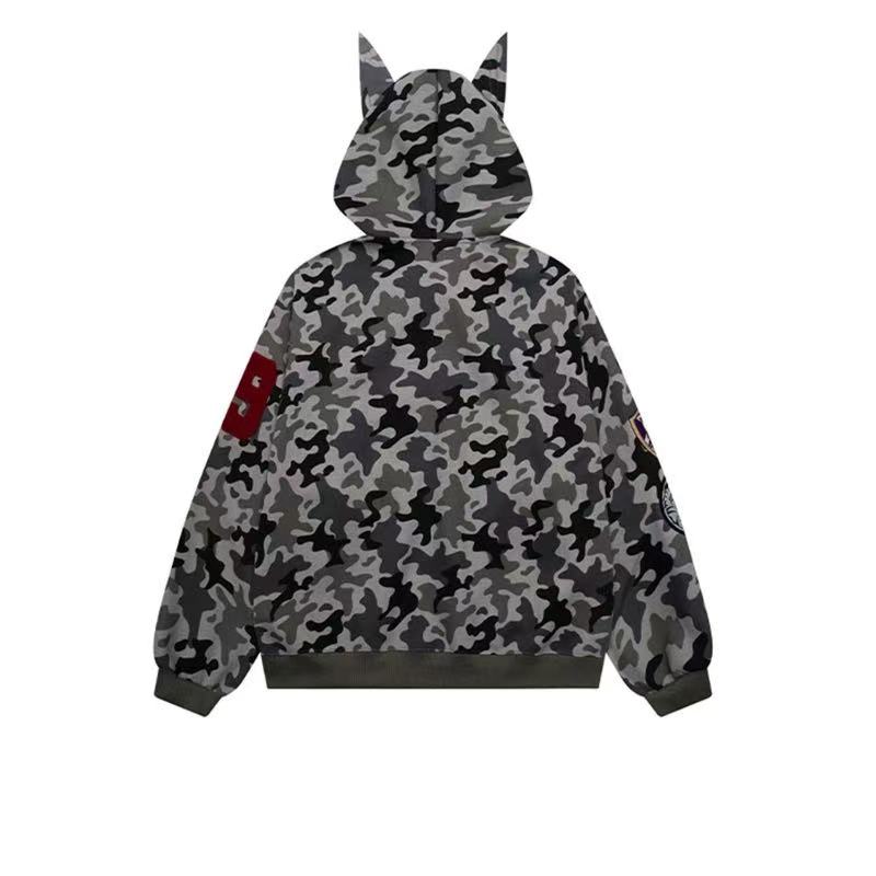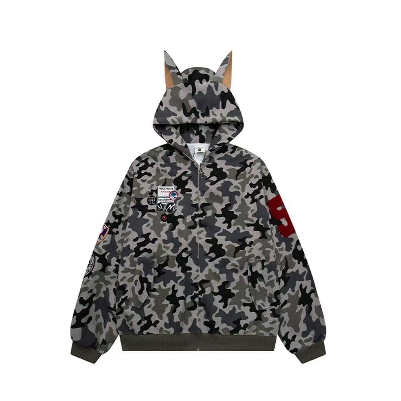 美式潮牌迷彩杜宾犬开衫连帽卫衣