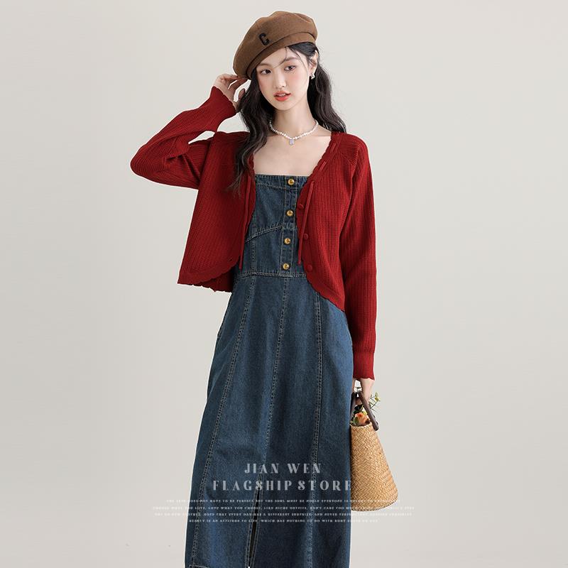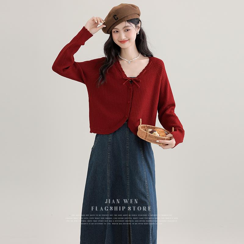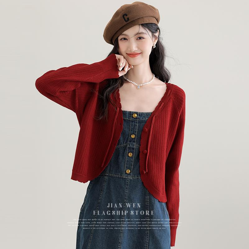 酒红色系带V领针织开衫女2025春秋新款宽松小个子短款毛衣外套潮