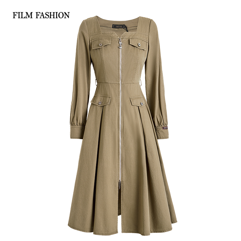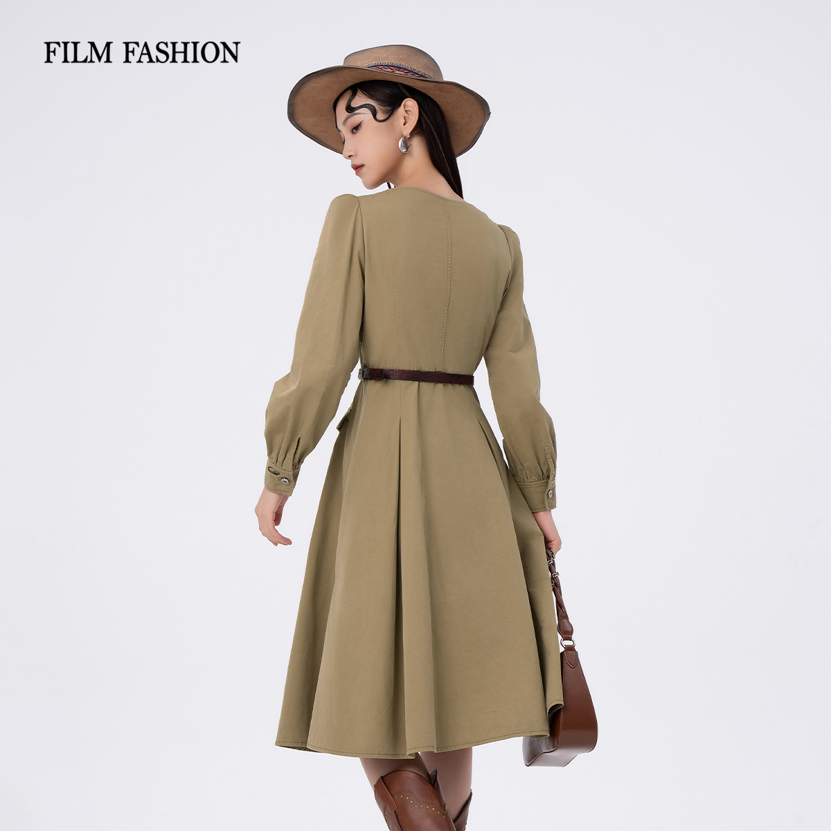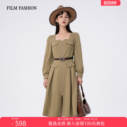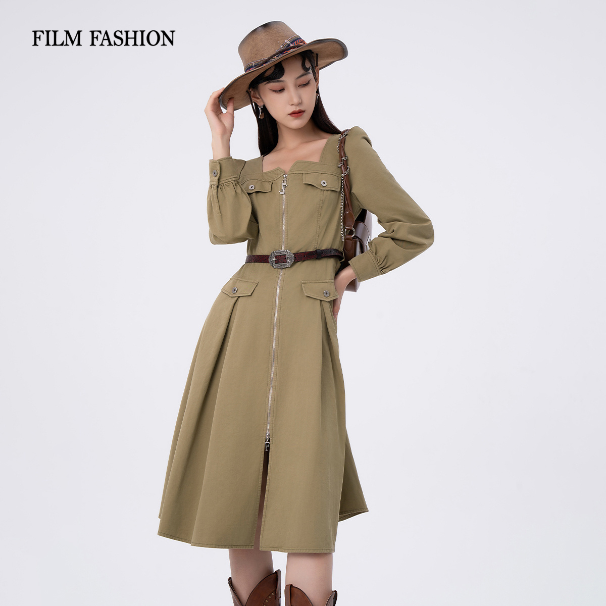 一电影一时装春秋复古方领特工工装新款连衣裙女款独特超好看裙子
