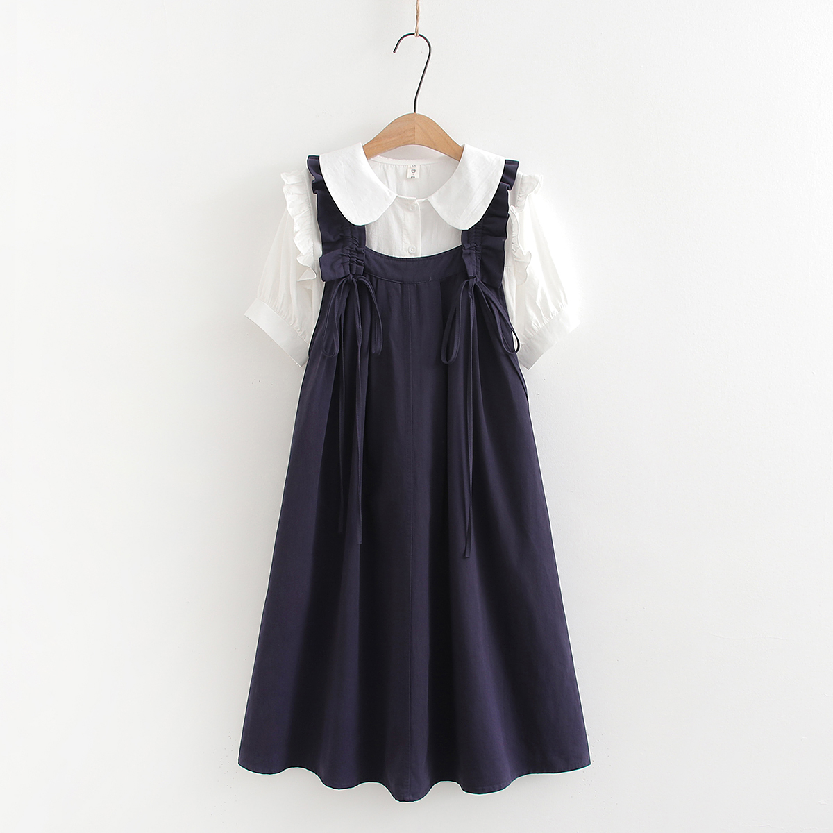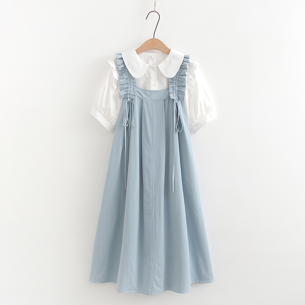 2025夏装新款森系文艺小清新娃娃领短袖衬衫+背带裙套装女