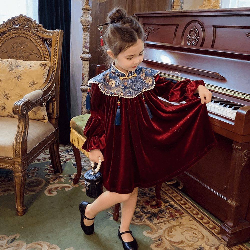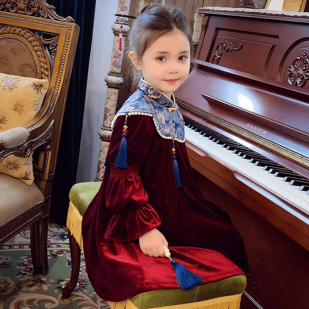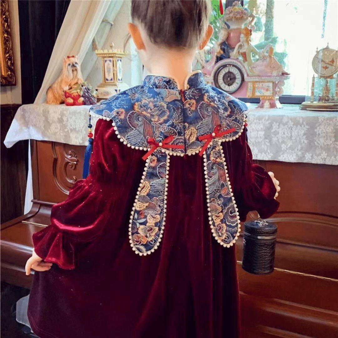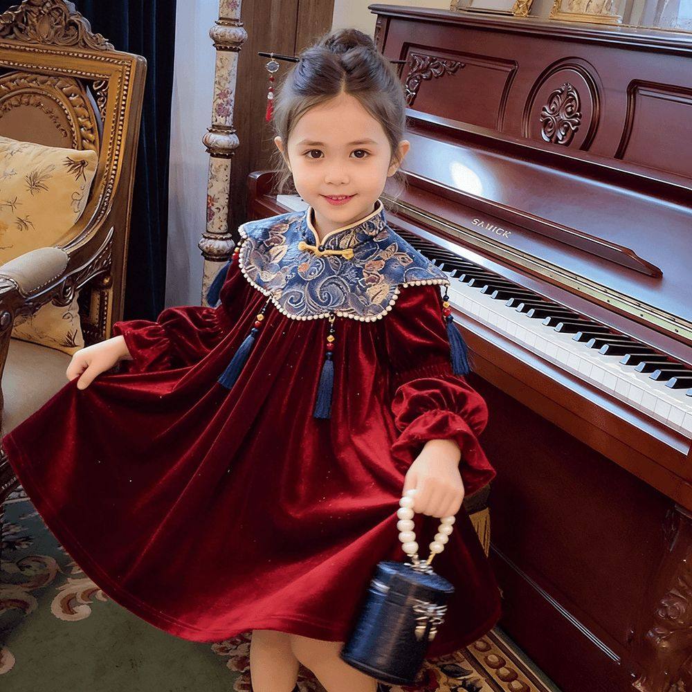 女童国风加绒云肩旗袍连衣裙秋冬季2026新款儿童洋气拜年公主裙子