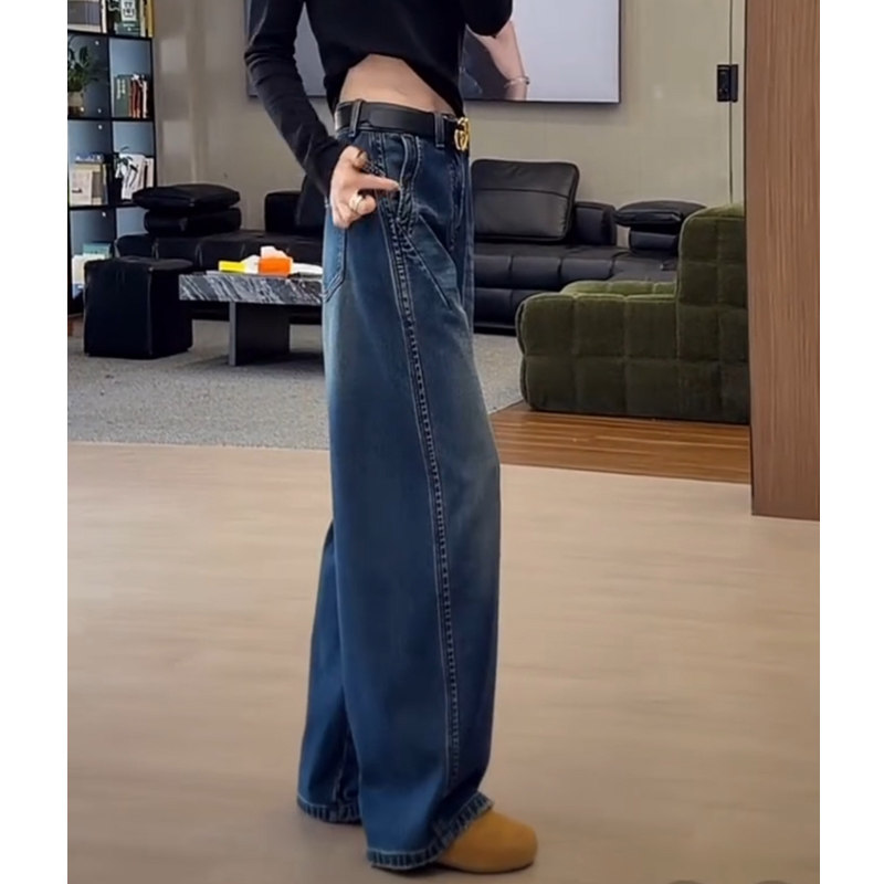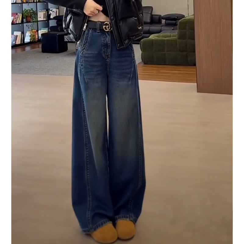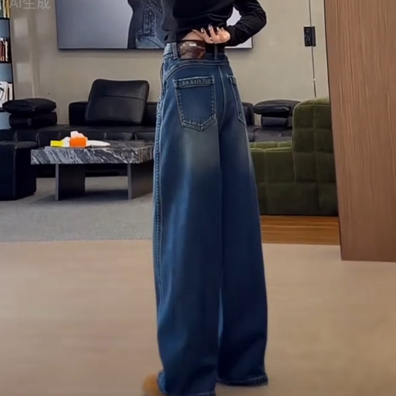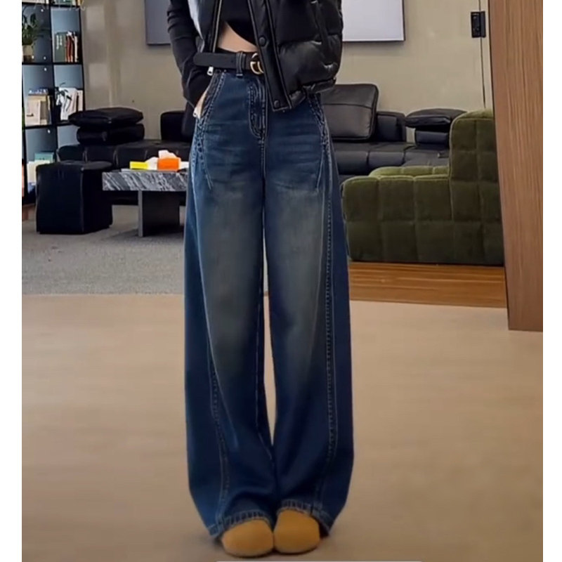 牛仔裤女2025年冬季新款爆款裤子加绒加厚长裤高腰蓝色百搭阔腿裤