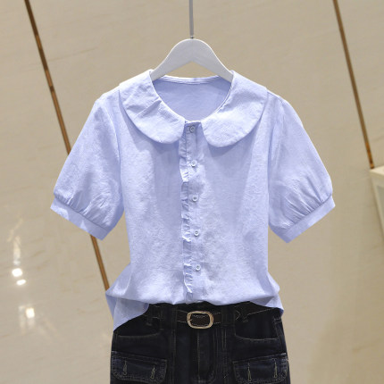 夏季新款甜美时尚清新设计娃娃领棉布衬衫泡泡宽松上衣女短袖衬衣