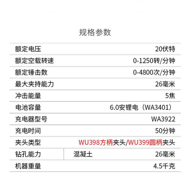 威克士无刷重载锂电锤WU399/398