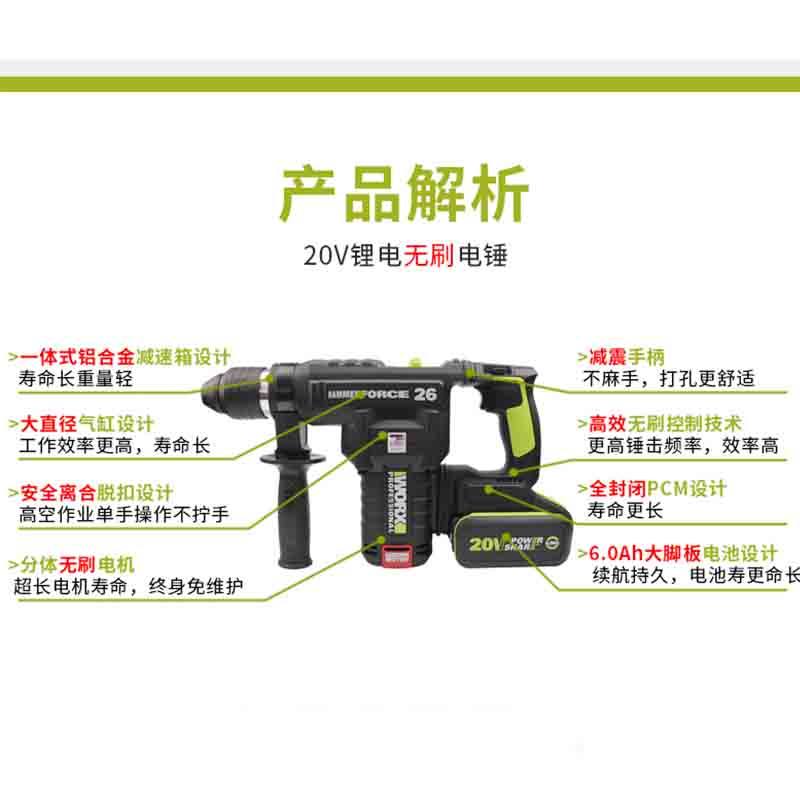 威克士充电电锤WU398/WU399重型专业两用电镐冲击钻混凝土锂电捶