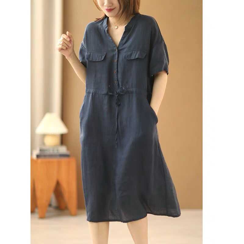 2025夏季新款亚麻棉麻连衣裙宽松大码气质V领松紧腰口袋工装长裙