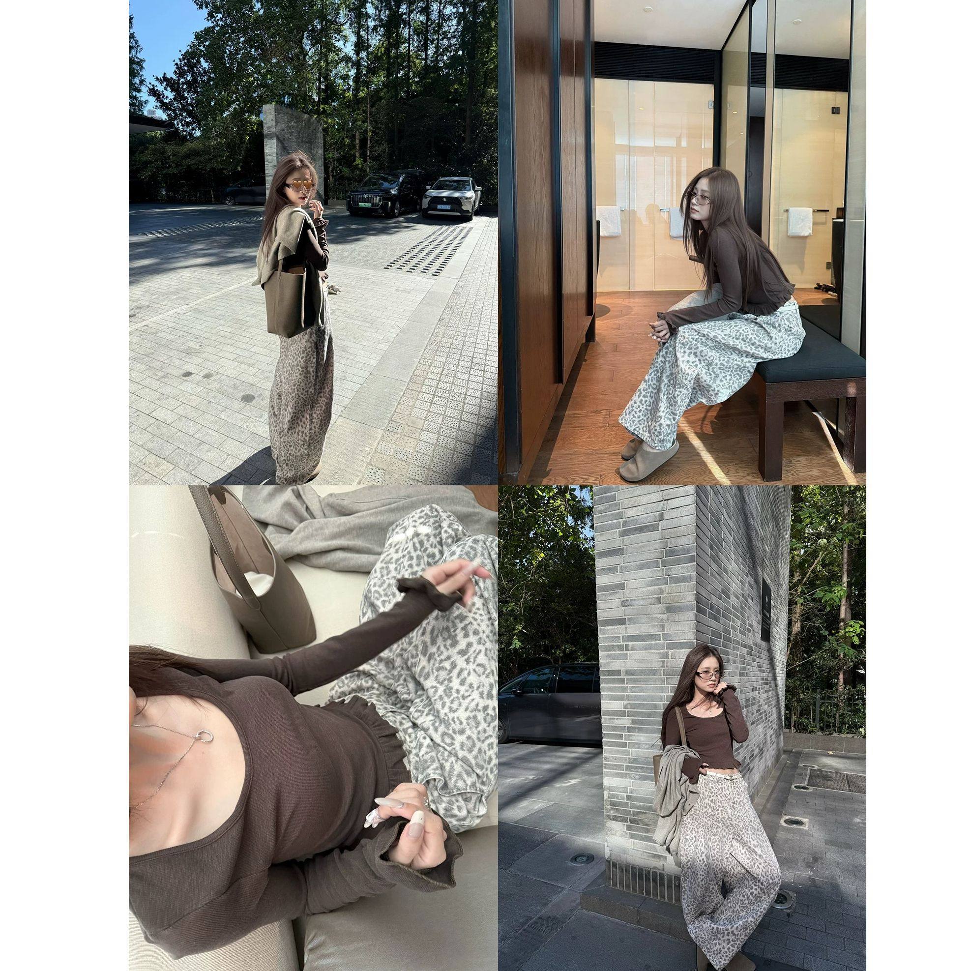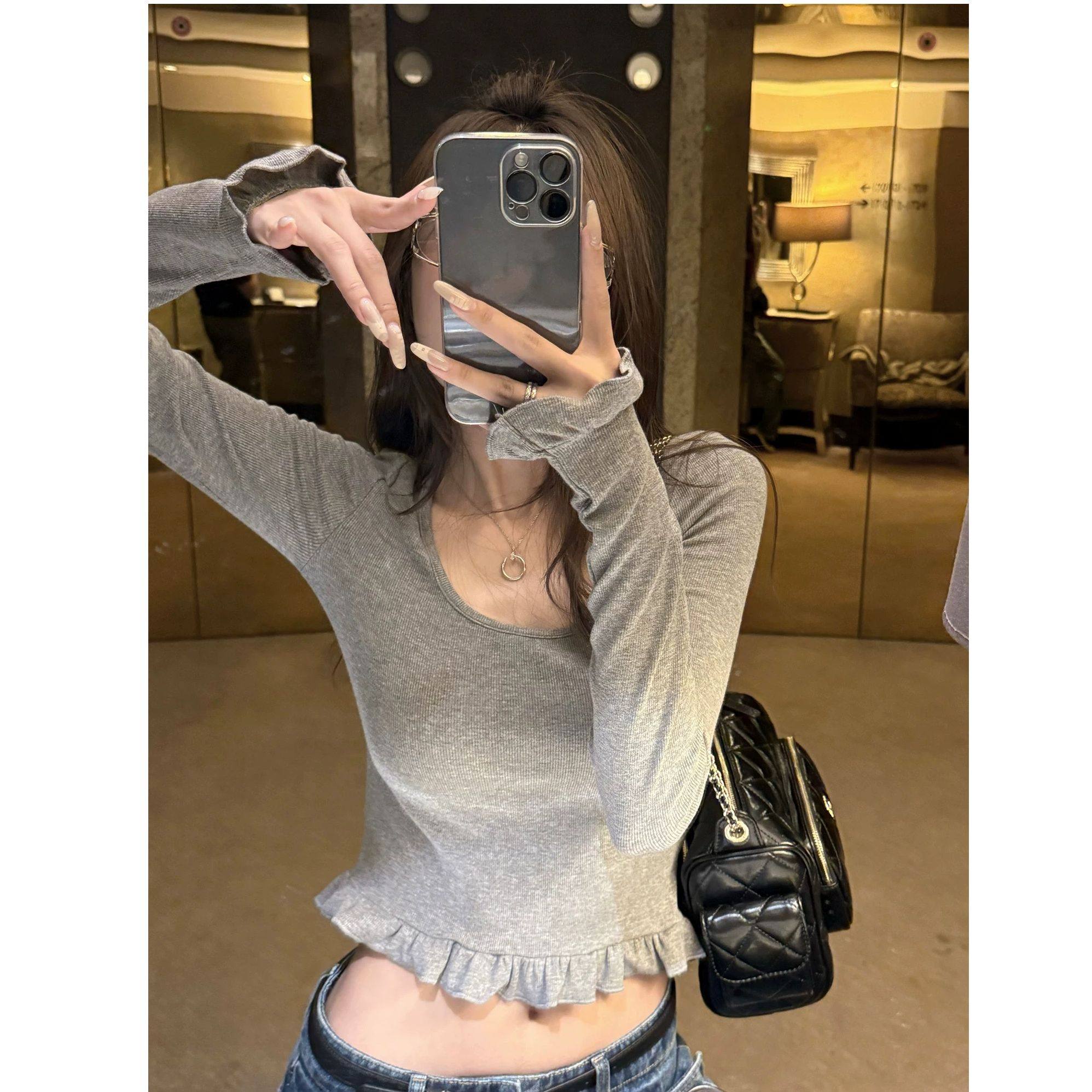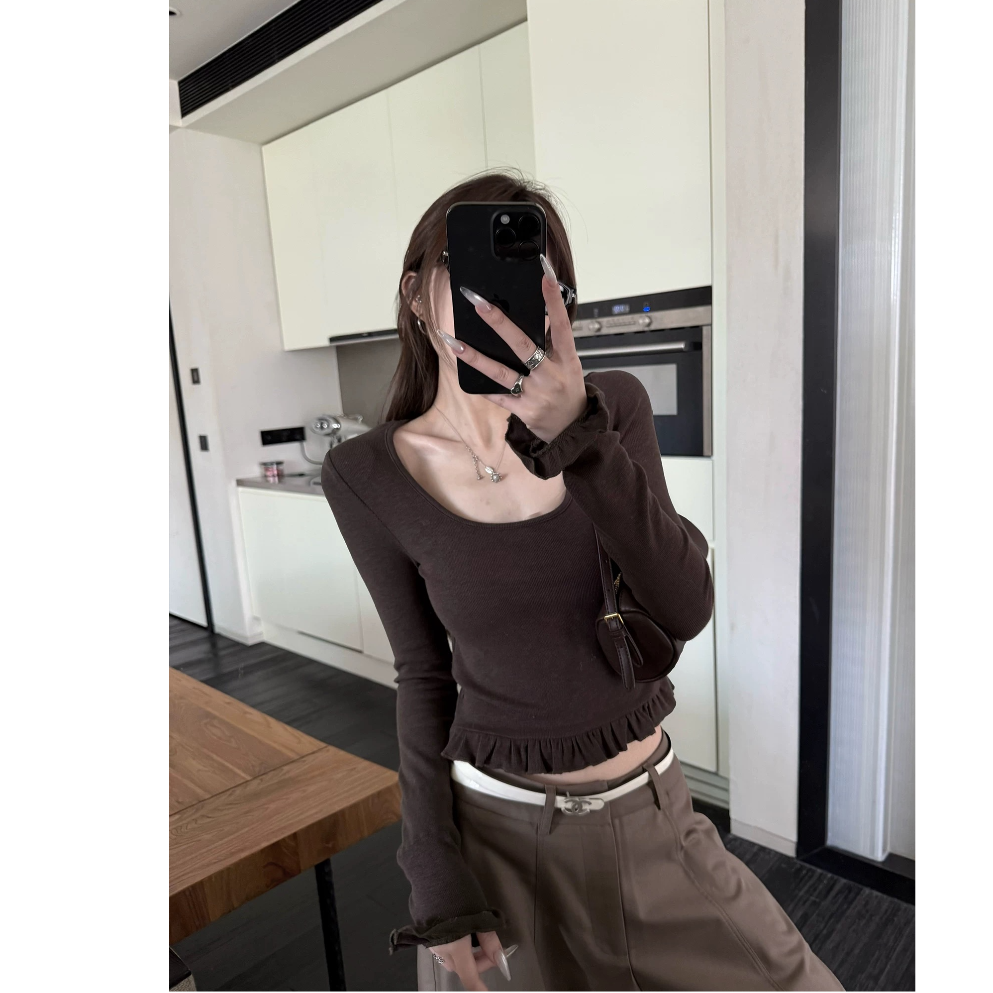 秋季新款短款弹力螺纹竹节棉大圆领木耳花边长袖打底衫T恤女