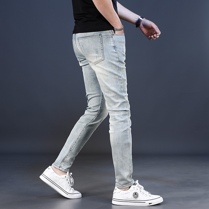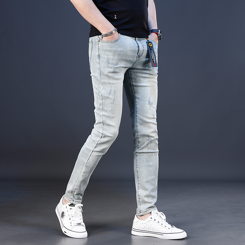 2025夏季浅蓝色薄款高弹力牛仔裤男潮流休闲百搭修身小脚显瘦裤子