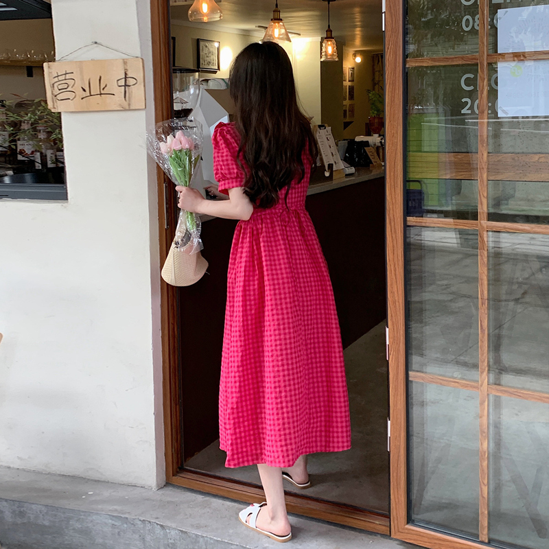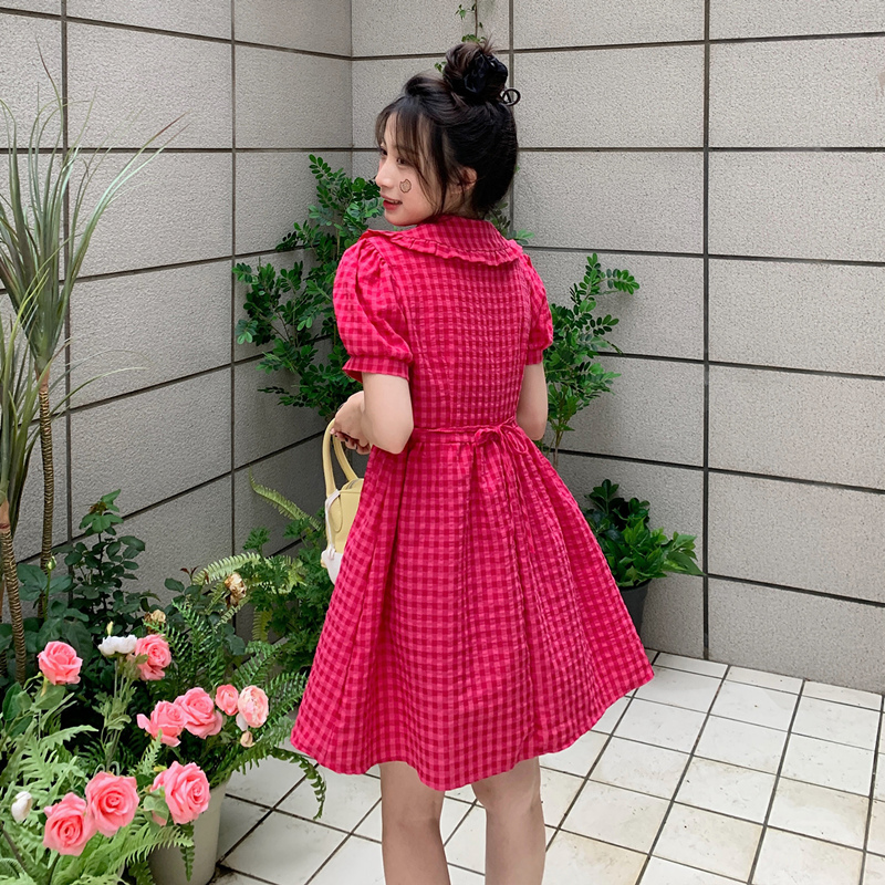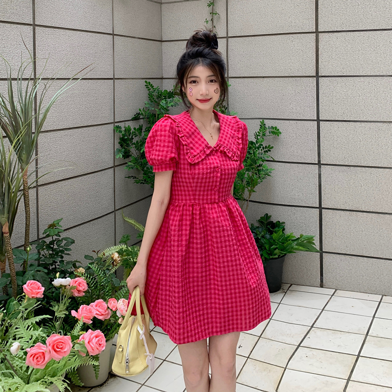 火龙果木耳边娃娃领格子连衣裙夏季法式泡泡袖小个子收腰初恋短裙