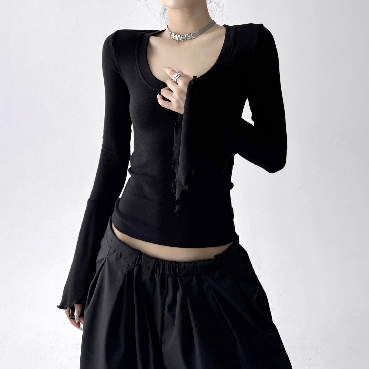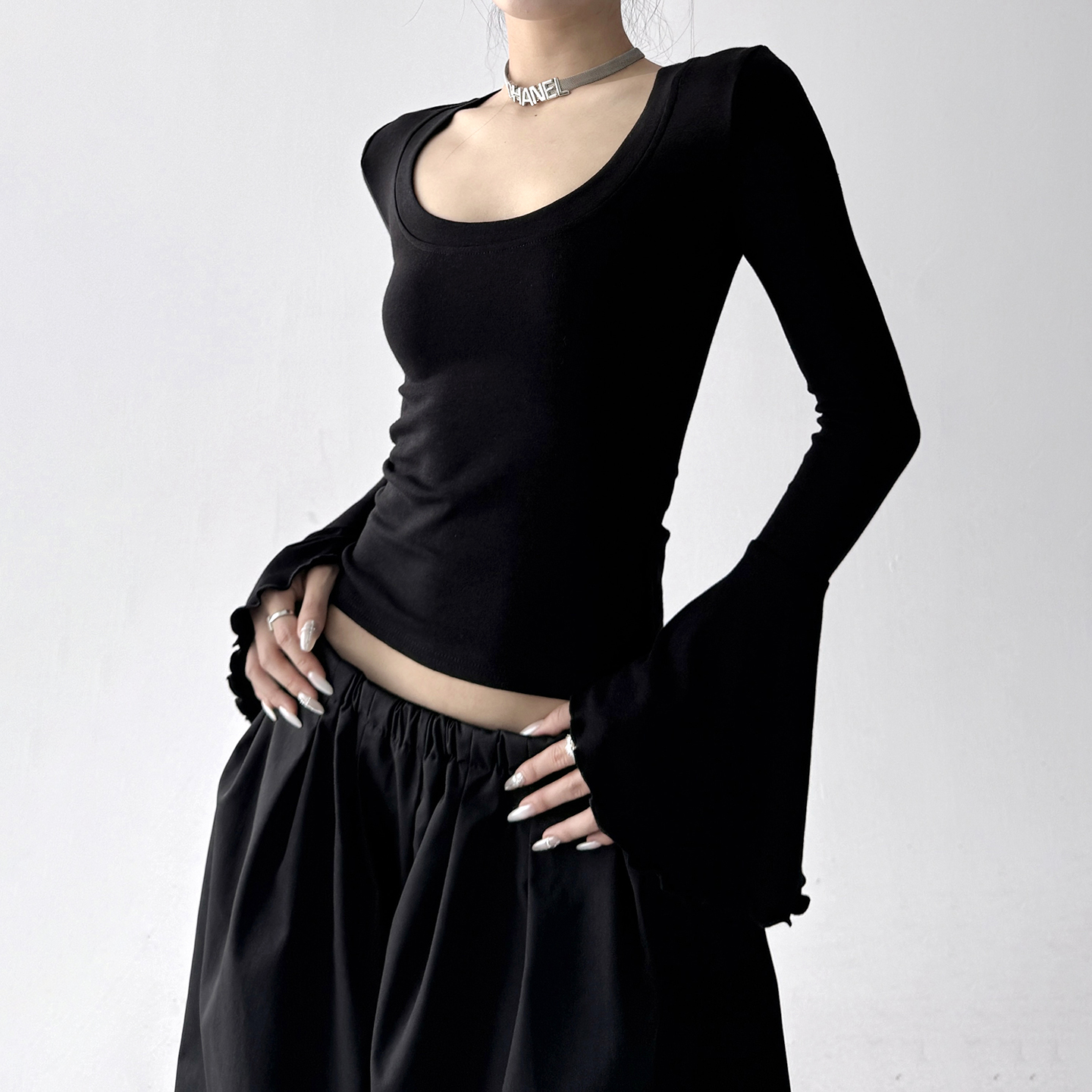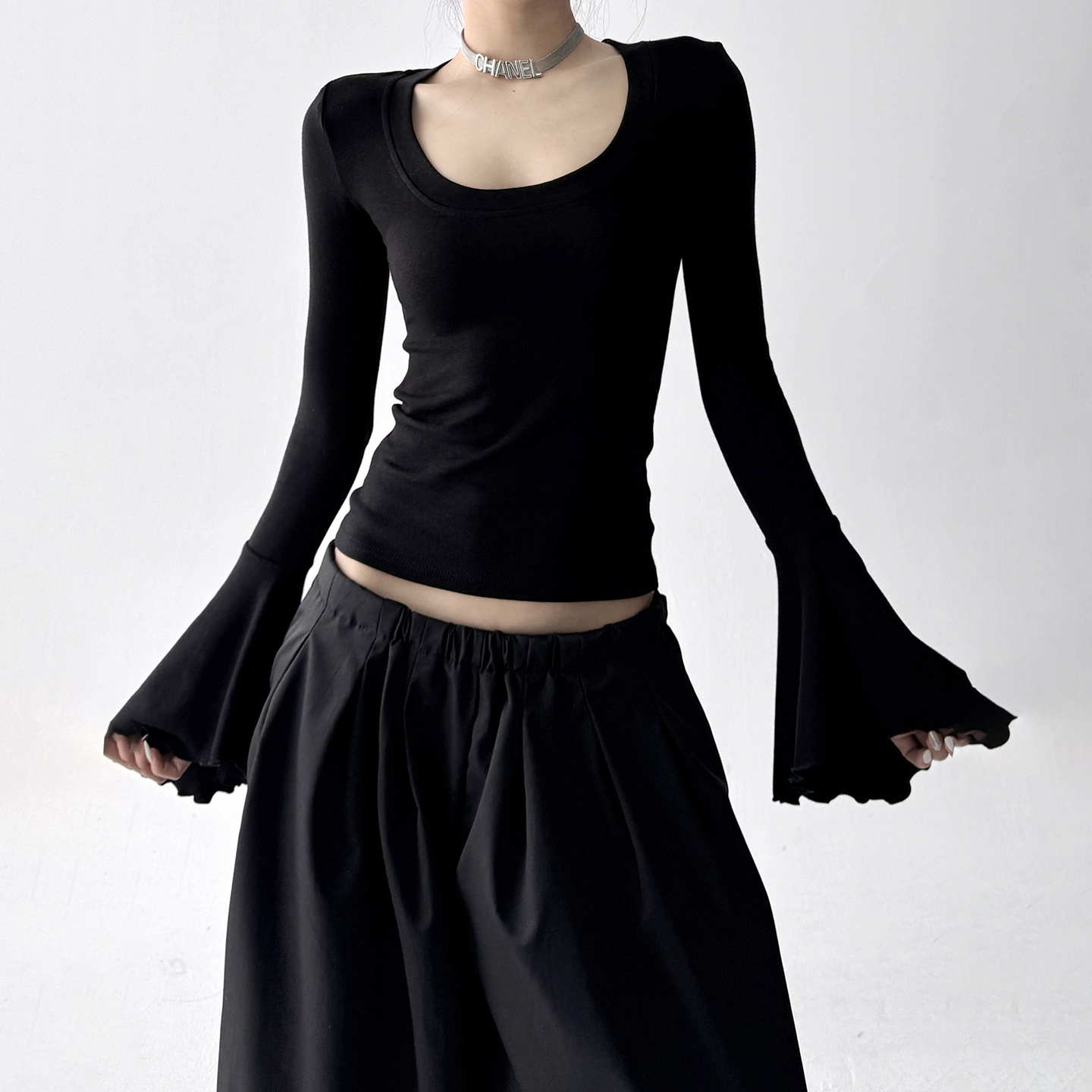 辣妹U领喇叭袖设计长袖T恤女2025春秋季新款修身显瘦上衣打底衫