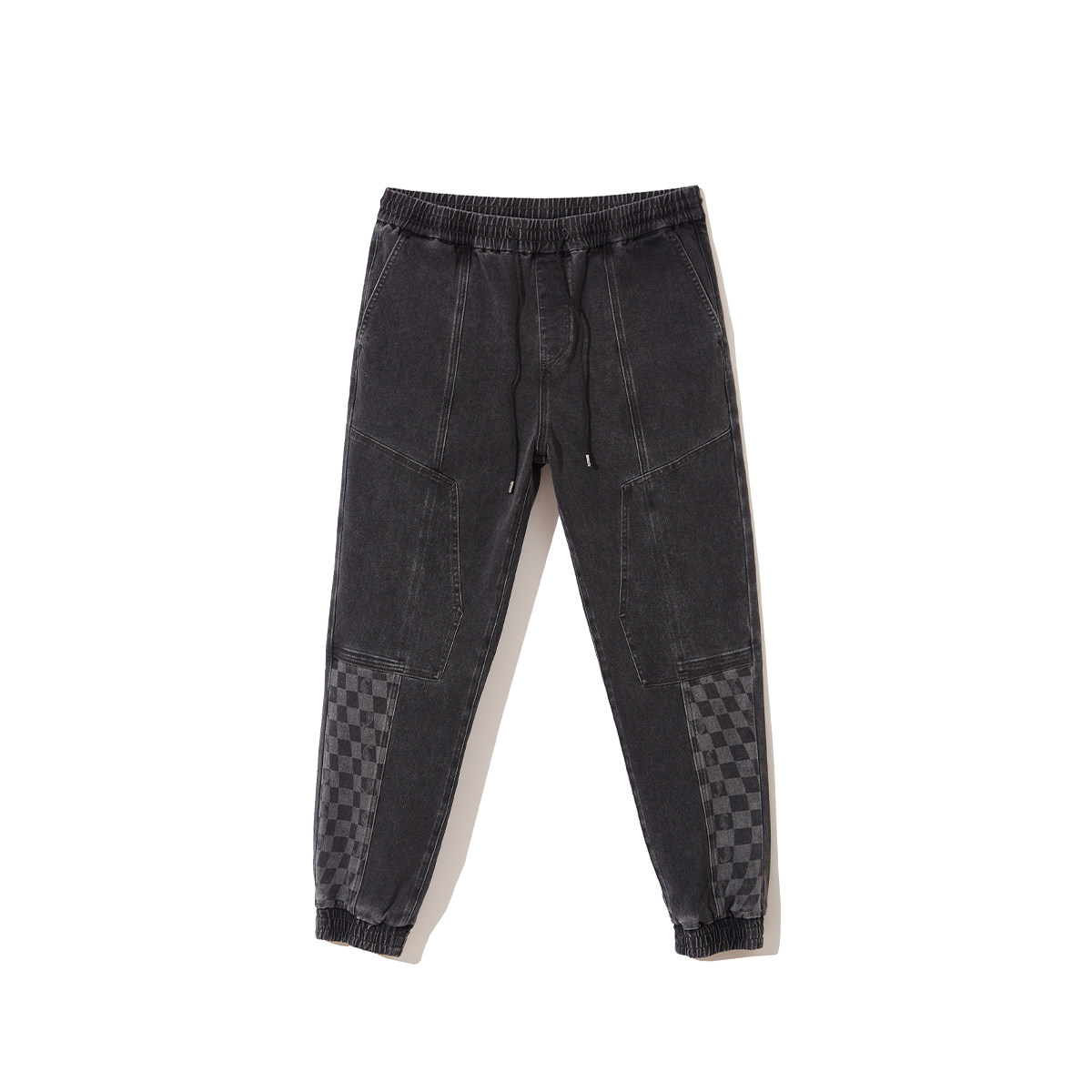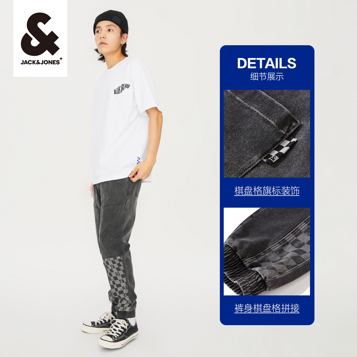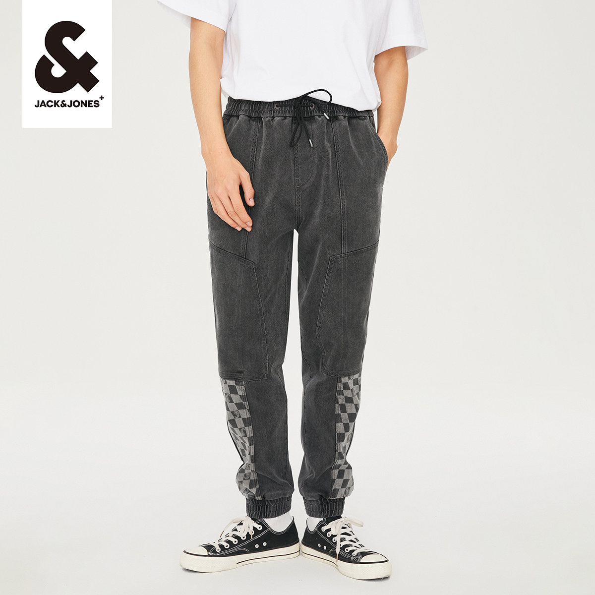 t区绫致杰克琼斯25男潮流高街个性棋盘格拼接舒适弹力束脚牛仔裤