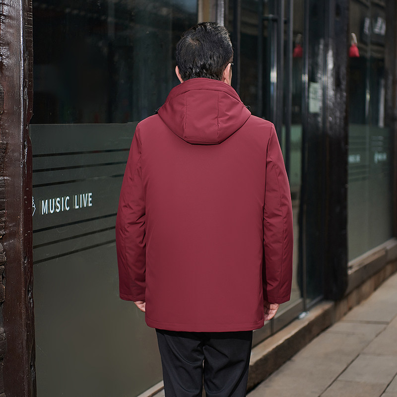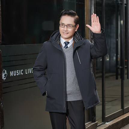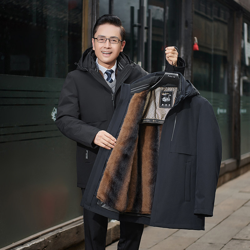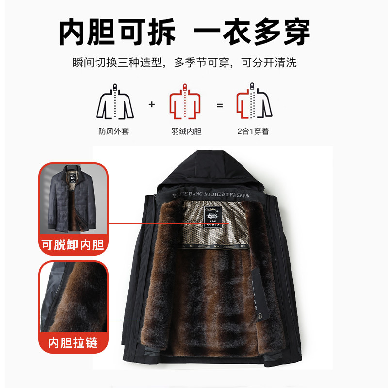 花花公子商务羽绒服男士中长款连帽可脱卸内胆加厚保暖外套爸爸装