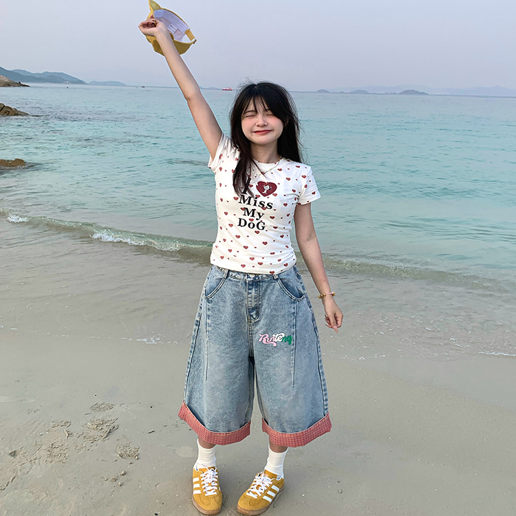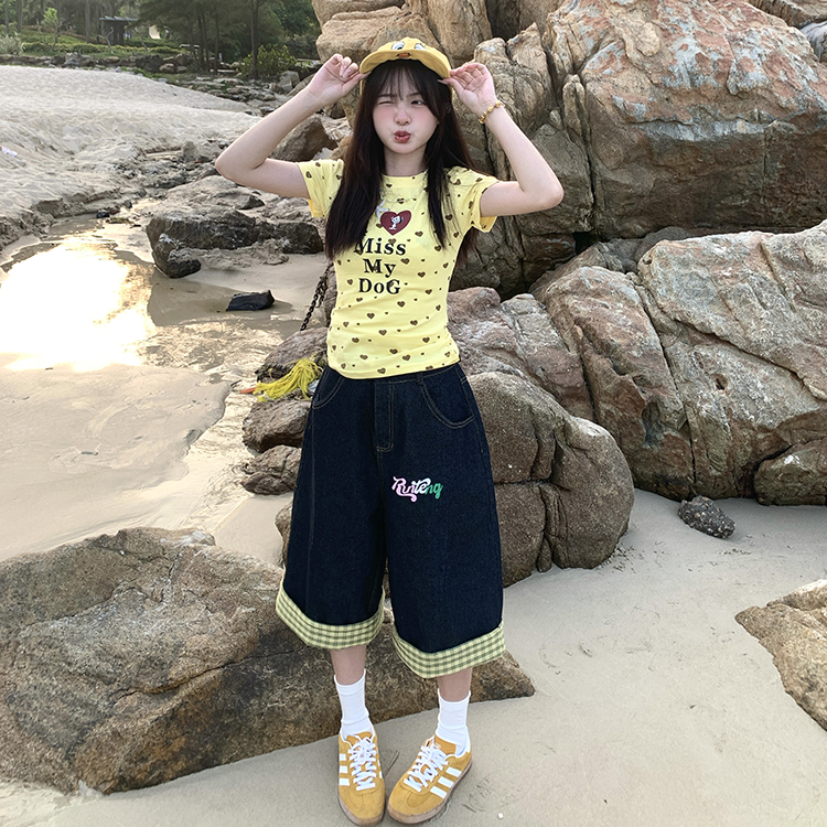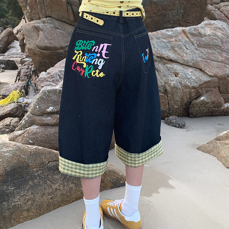 GTGA 美式复古街头格纹拼接牛仔七分裤男女夏季显瘦百搭阔腿短裤