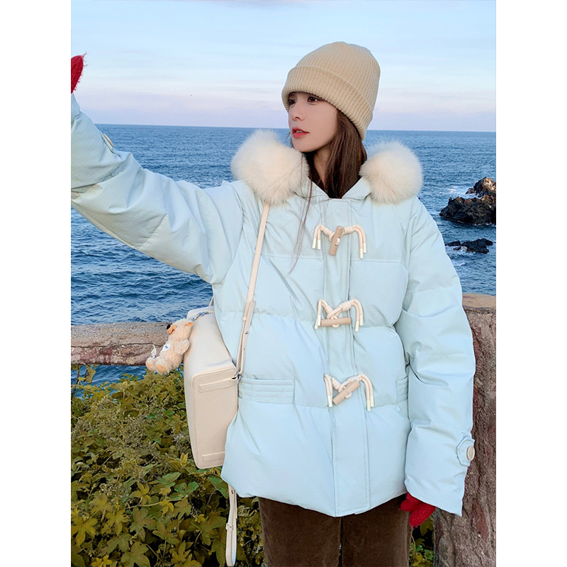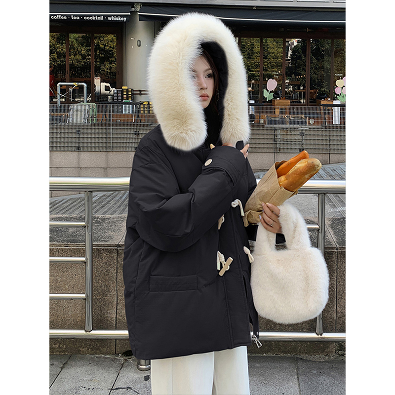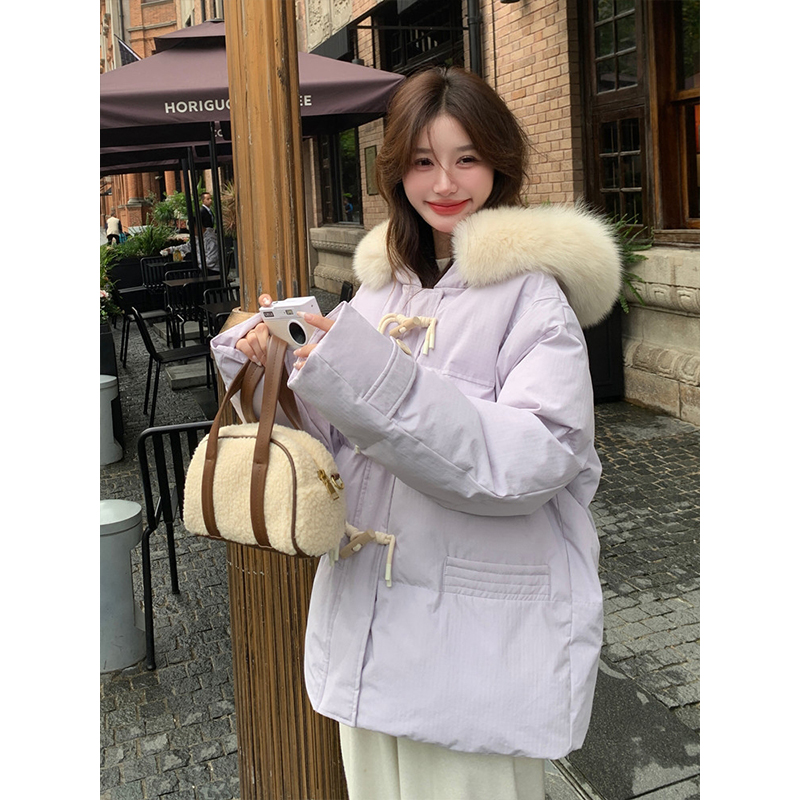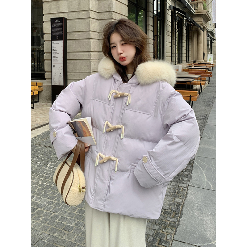 大码女装胖mm紫色牛角扣棉服女韩系宽松大毛领加厚连帽面包服外套