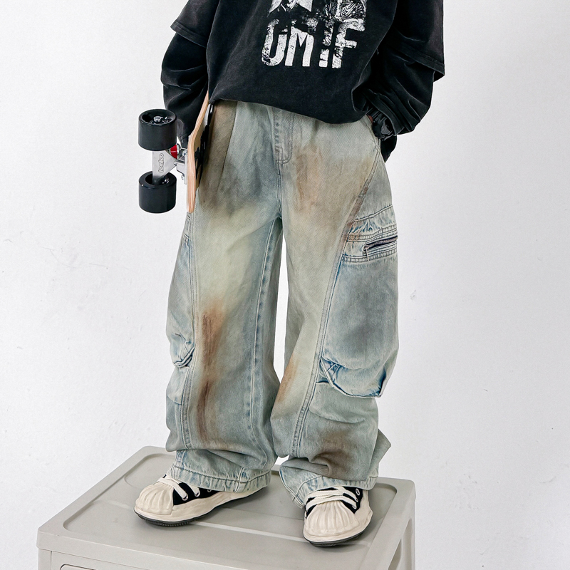 男童春秋痞帅大口袋工装阔腿牛仔裤2025新款儿童秋季直筒宽松裤子