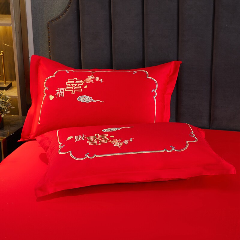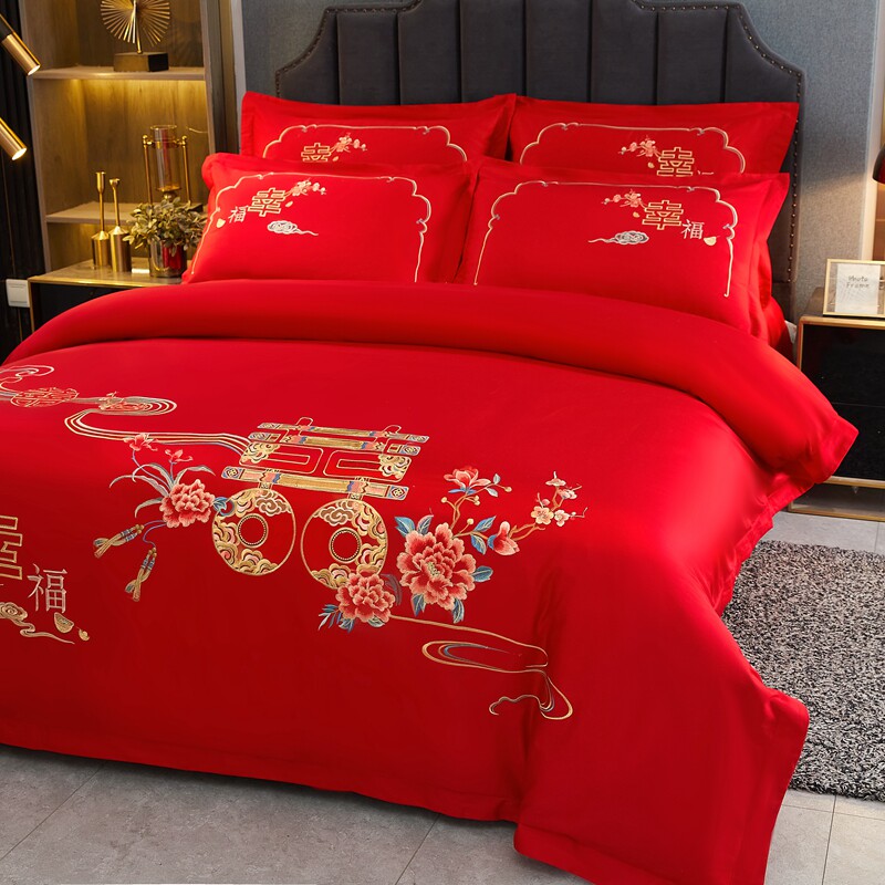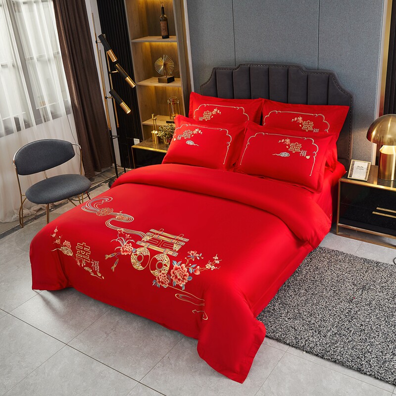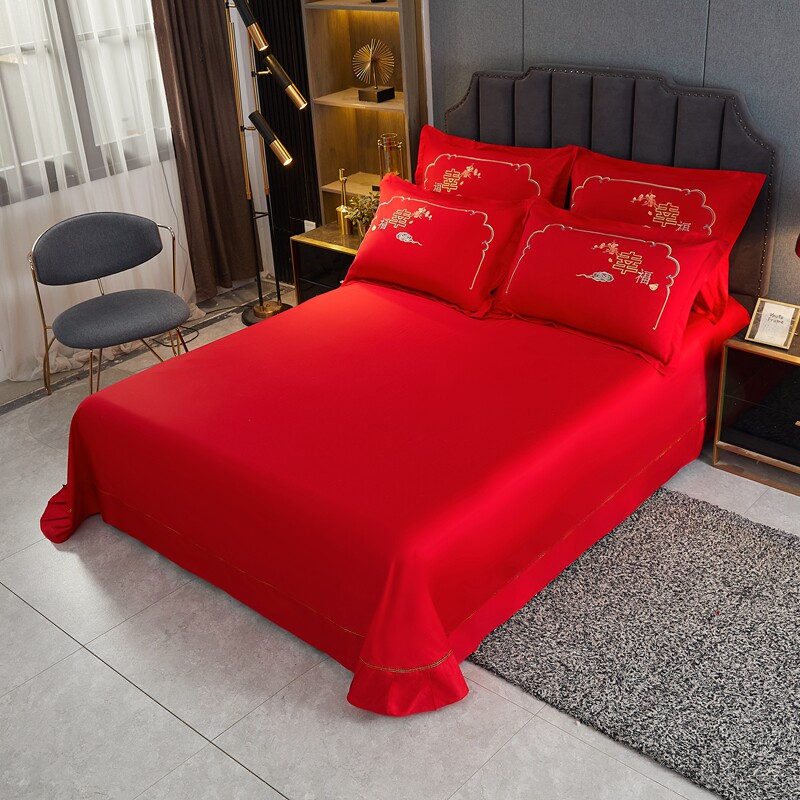100S长绒棉新婚庆四件套纯棉大红色双喜被套结婚喜被床单床上用品