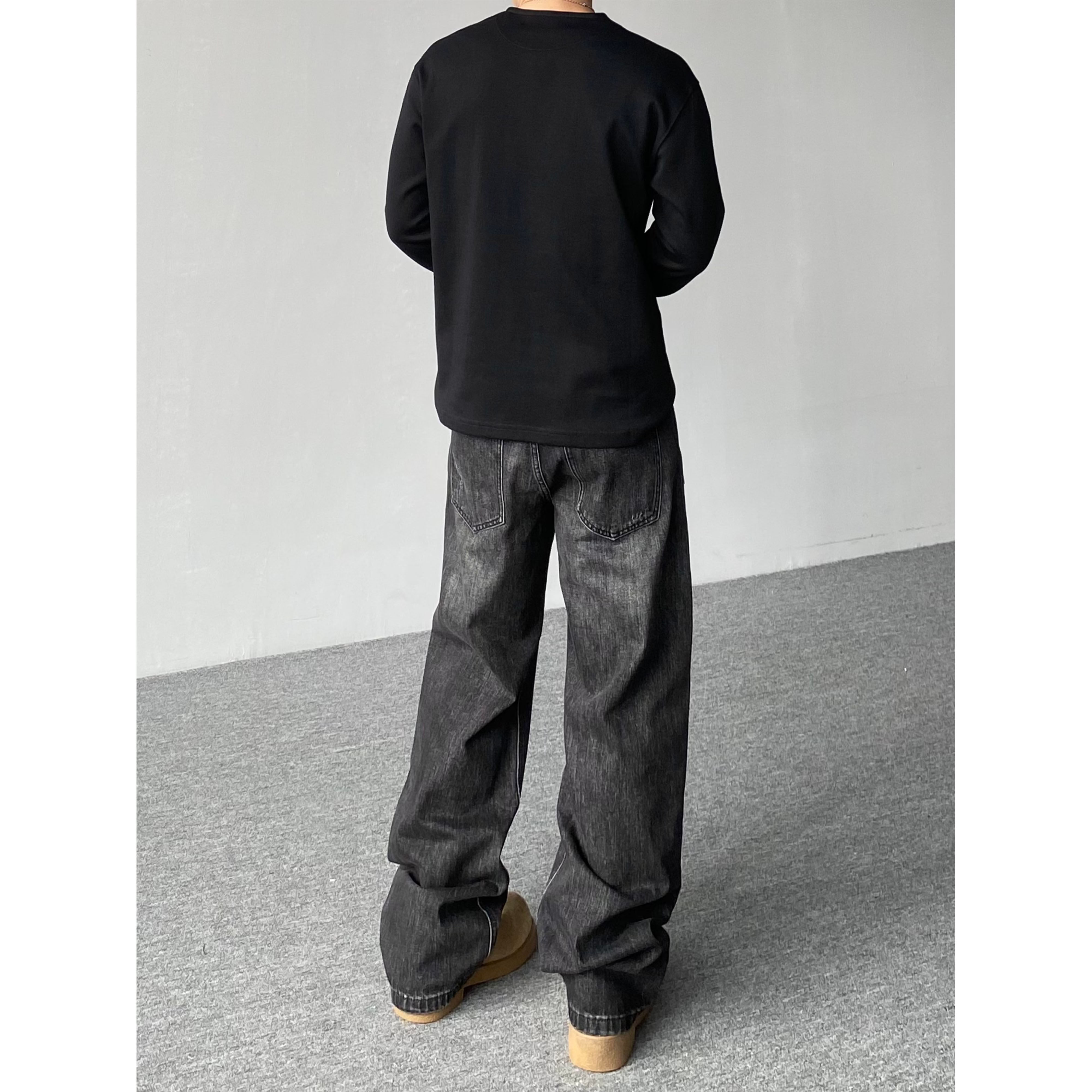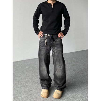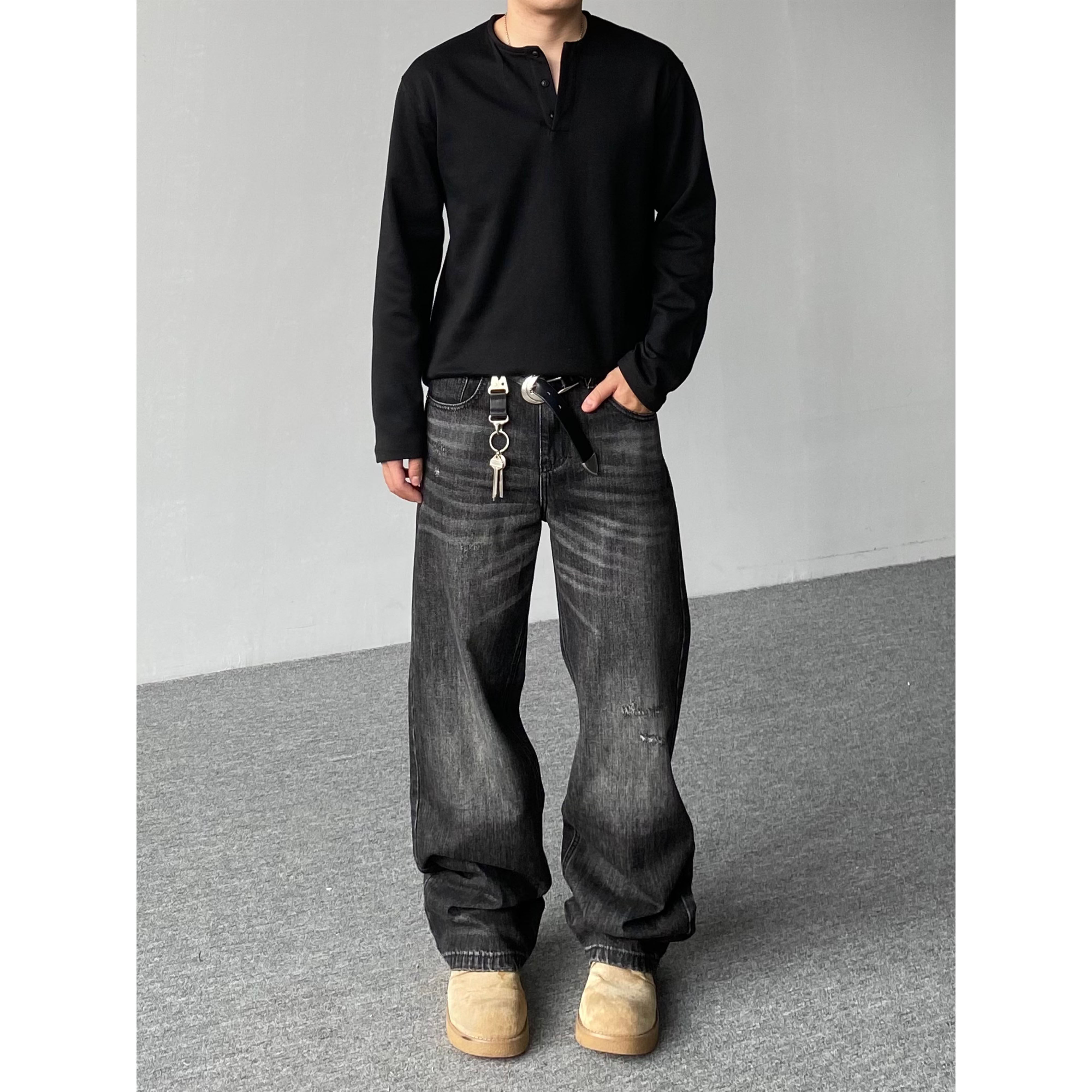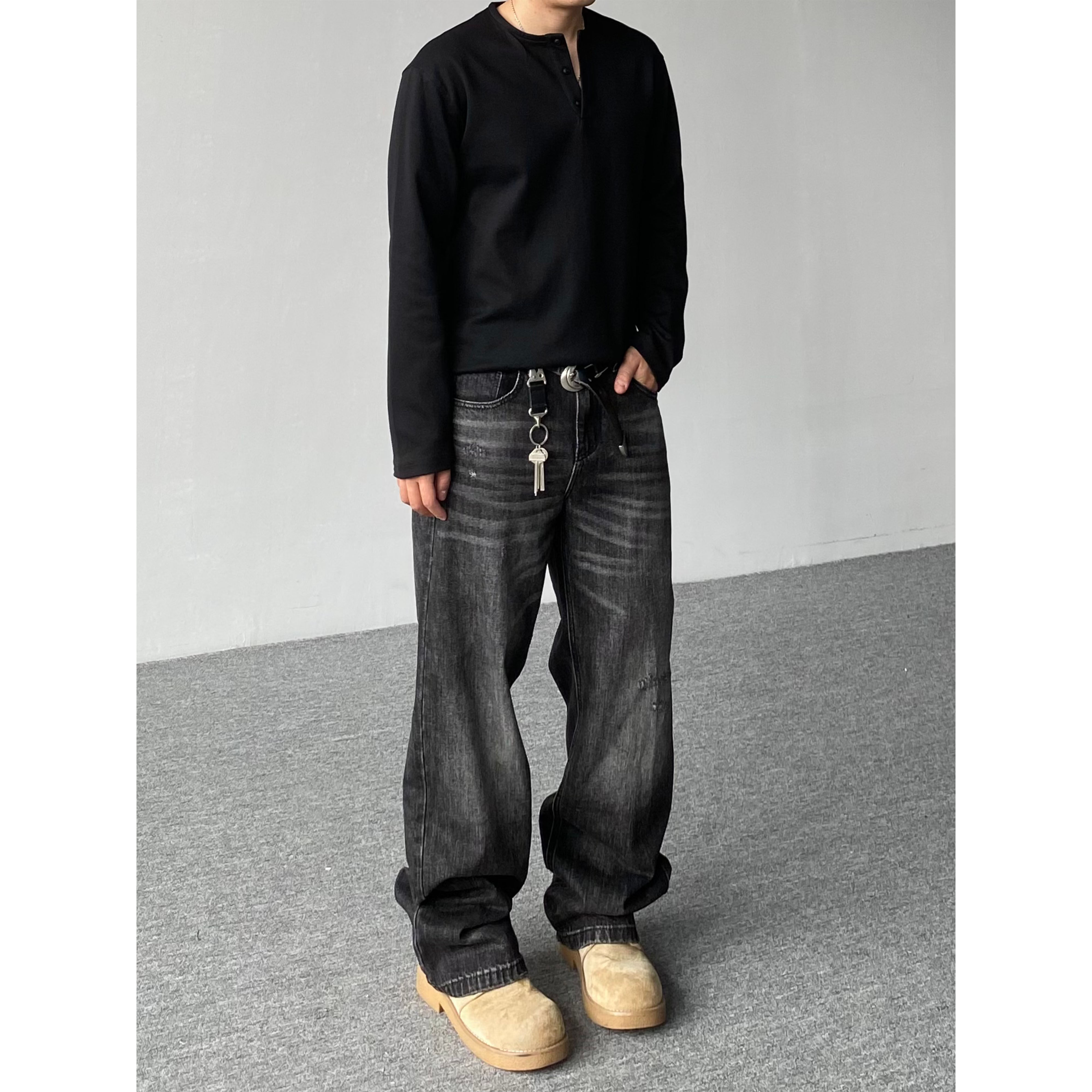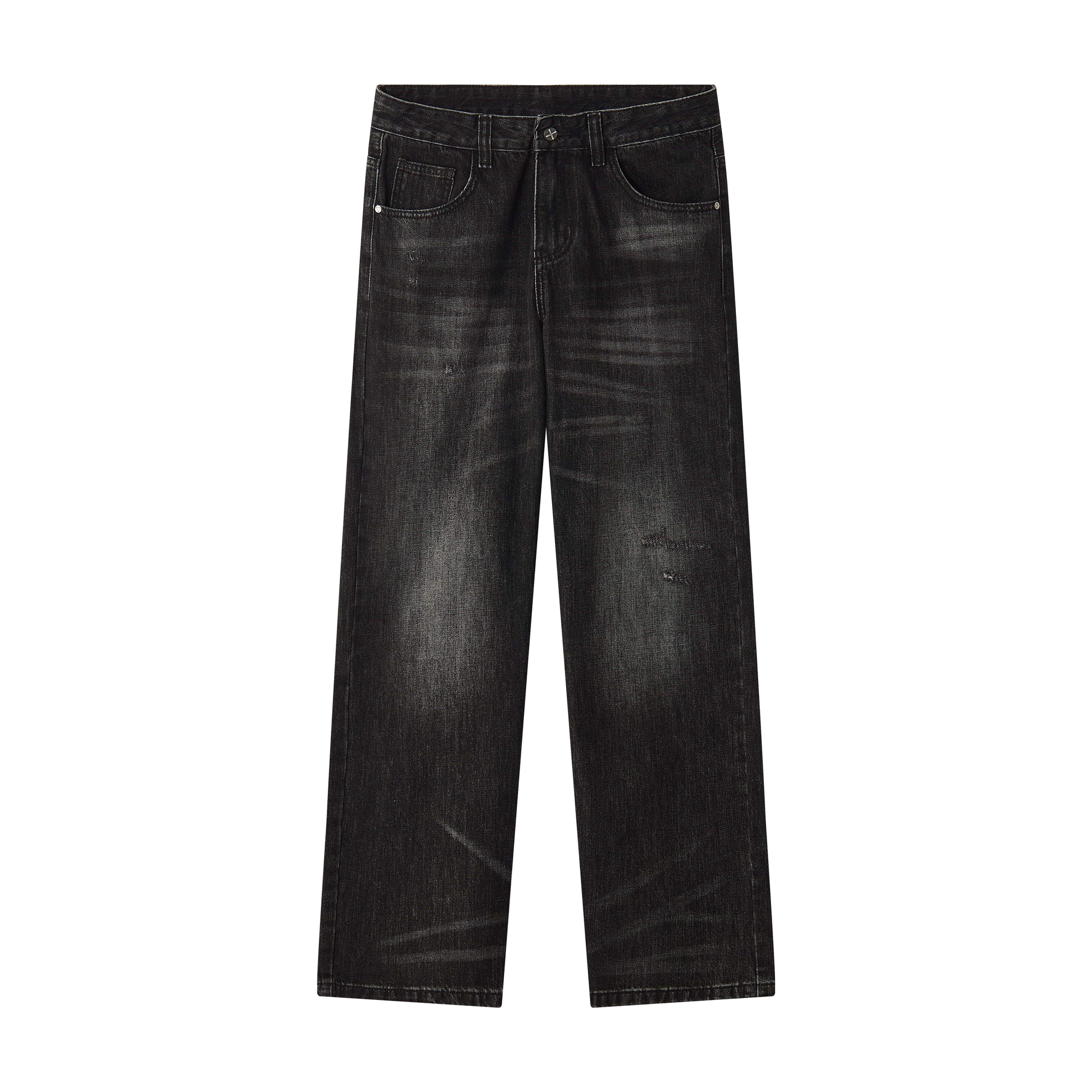 98SQUID 美式复古水洗黑色刮破牛仔裤男女宽松休闲阔腿垂感长裤潮