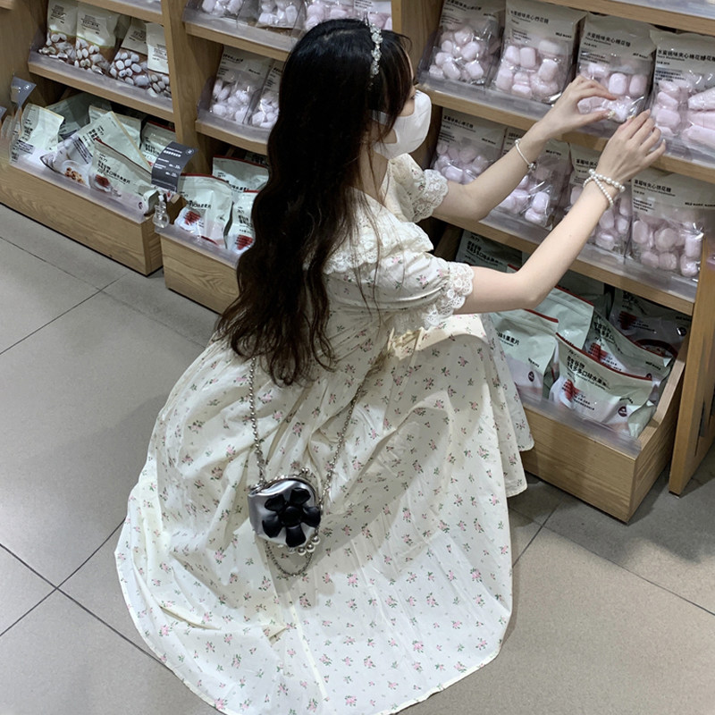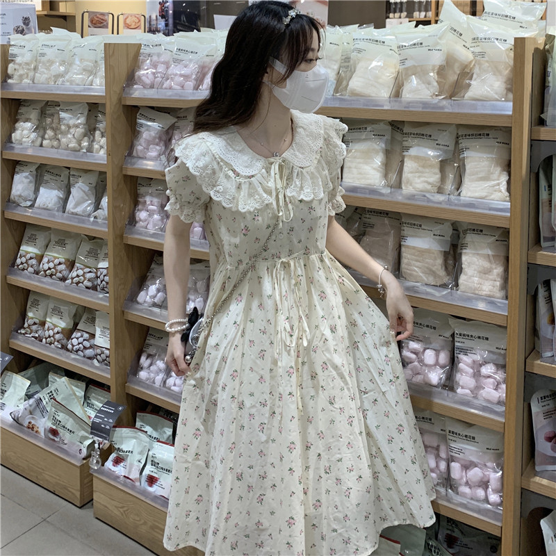 学院风连衣裙少女夏装2025新款初中高中学生娃娃领碎花收腰中长裙