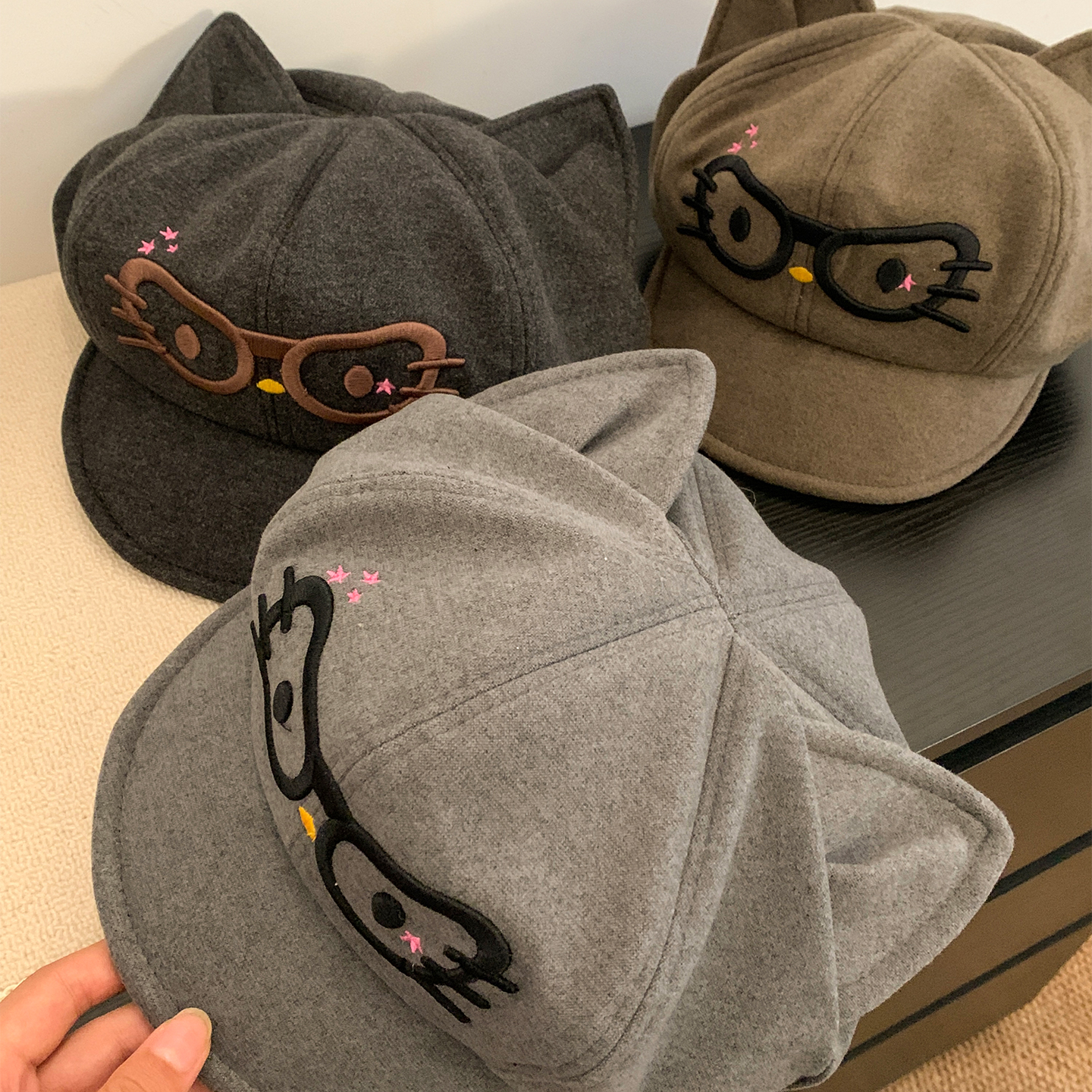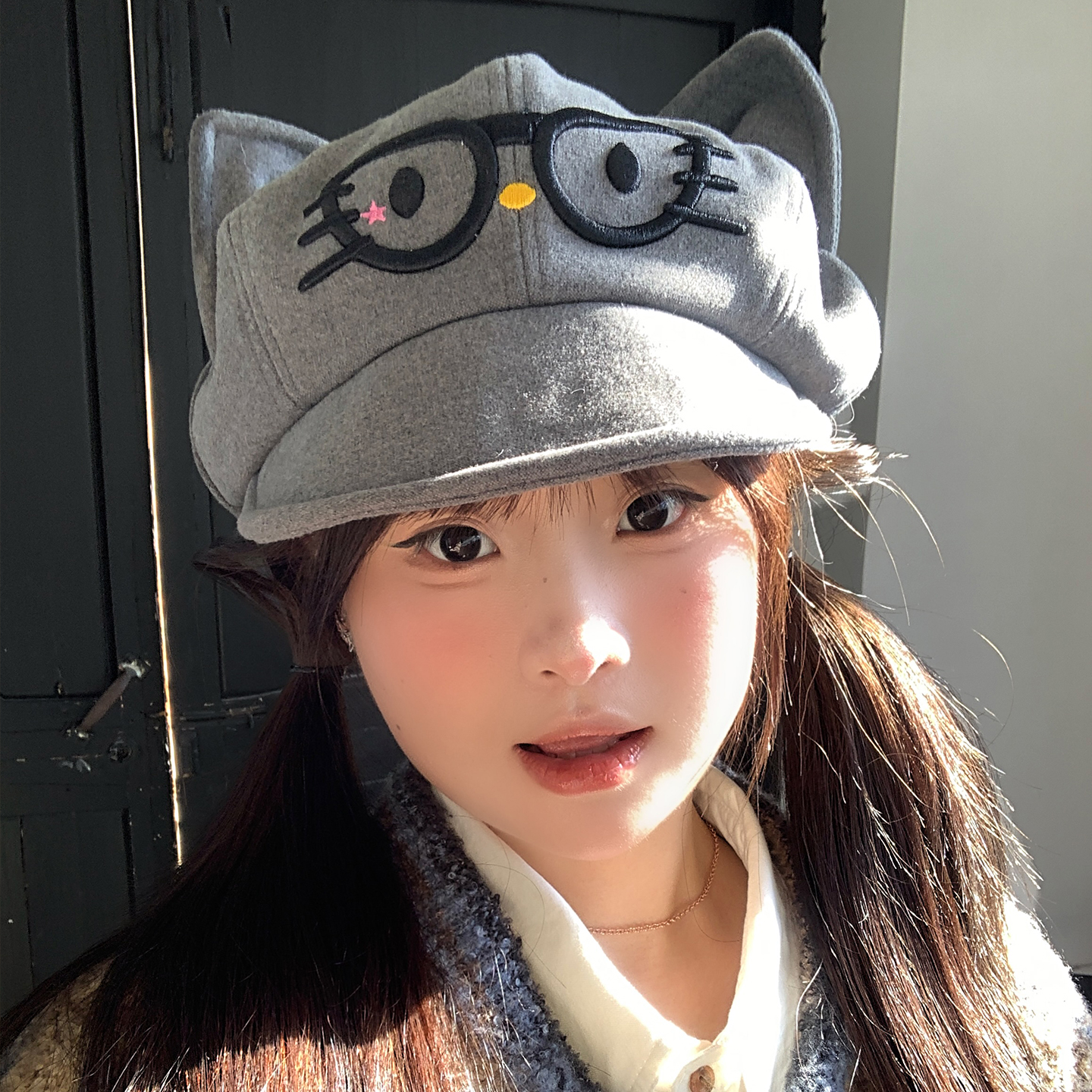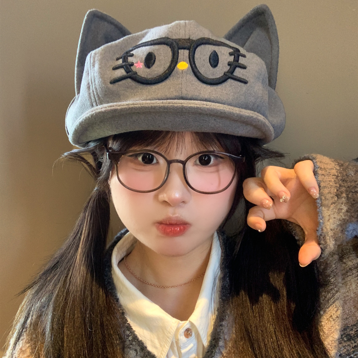 可爱猫咪耳朵眼镜鸭舌帽女秋冬季