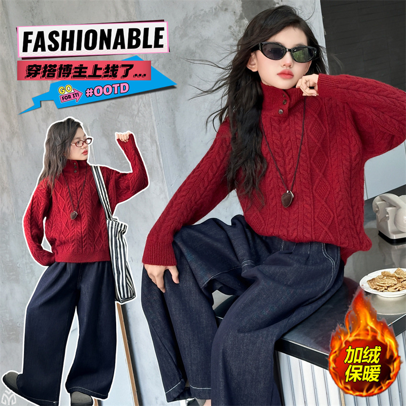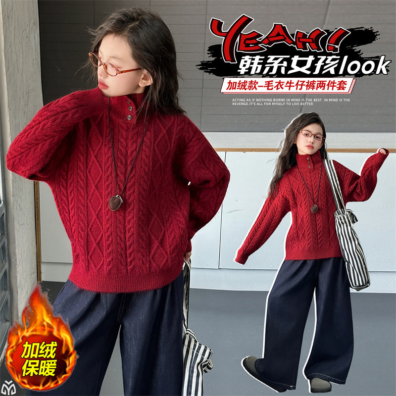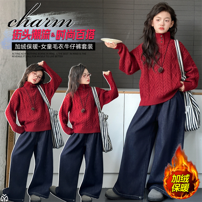 女童套装2025秋冬新款韩系复古麻花毛衣外套加厚牛仔阔腿裤