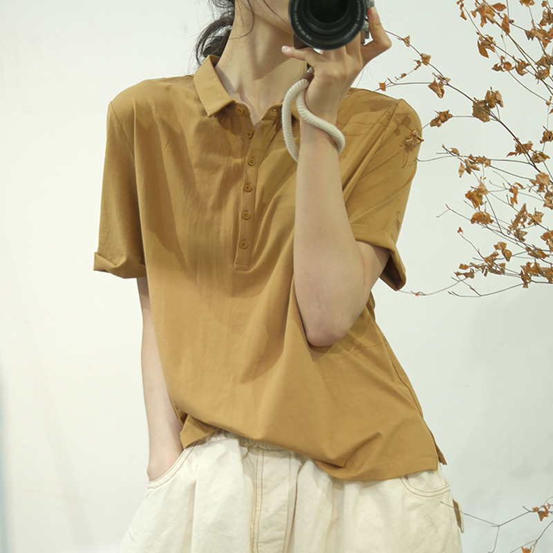 素凡卡夏季新款简约风文艺中式净色半开扣衬衣宽松短袖POLO衬衫女