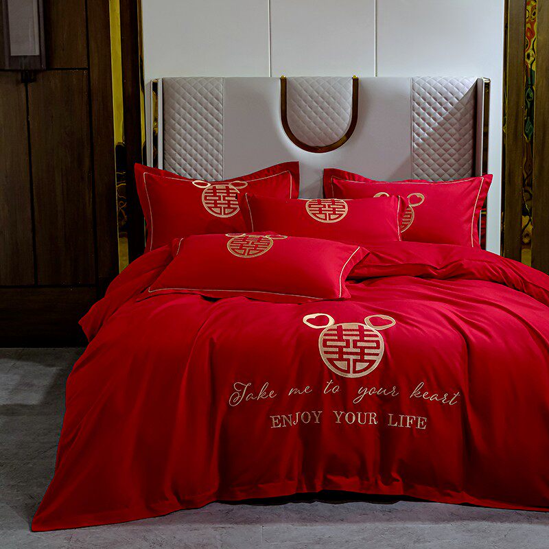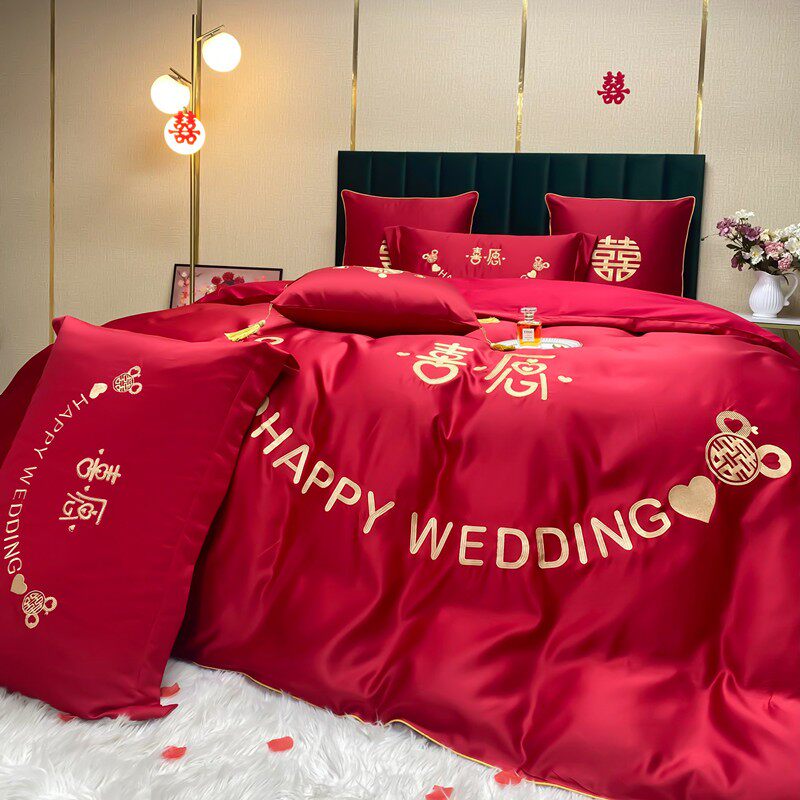 高档婚庆四件套全棉大红床单纯棉刺绣新结婚房嫁喜庆被套床上用品