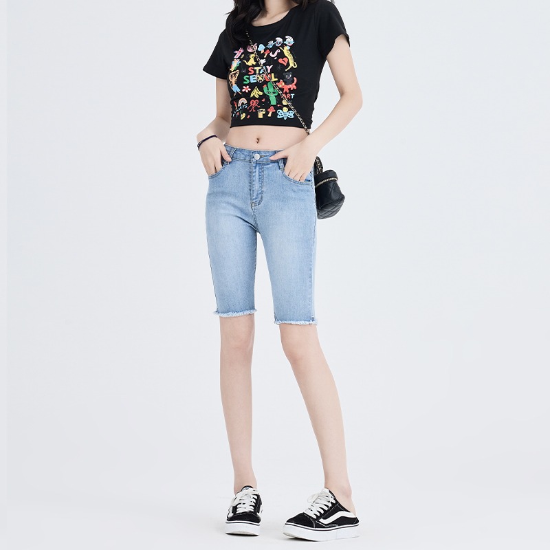 白色薄款牛仔五分裤女夏季2024年新款高腰弹力紧身毛边骑行中裤潮