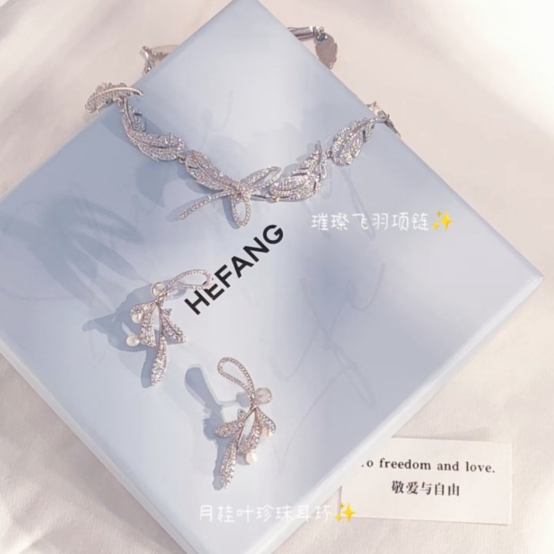 hefang925纯银何方月桂叶珍珠耳环告白情书闪闪羽毛丝带耳钉项链