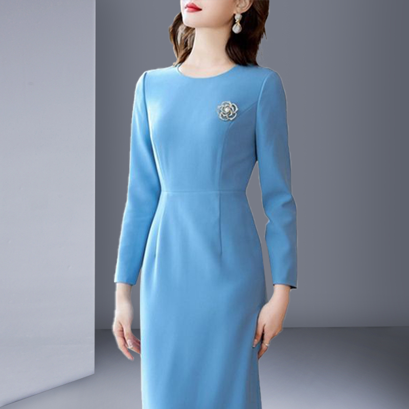 简约2025秋季新款修身高腰长袖连衣裙气质百搭浅蓝色中长裙一步裙