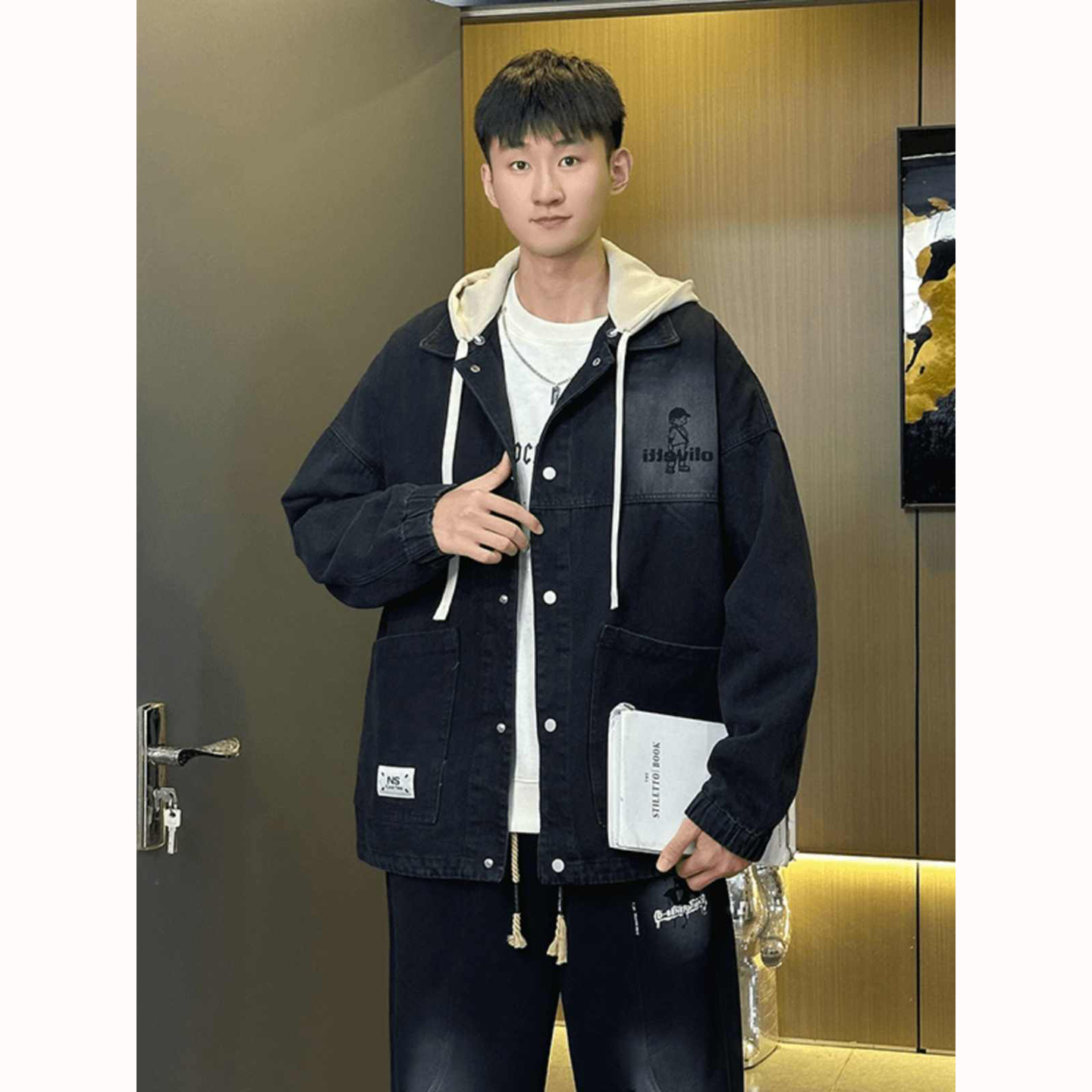 假两件连帽牛仔衣外套男春秋款美式复古夹克潮牌青少年休闲上衣服